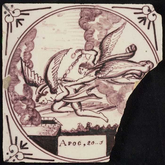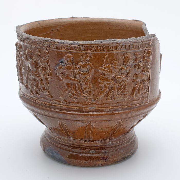 Bruine steengoed kruik, rond buik fries met bijbelsc...