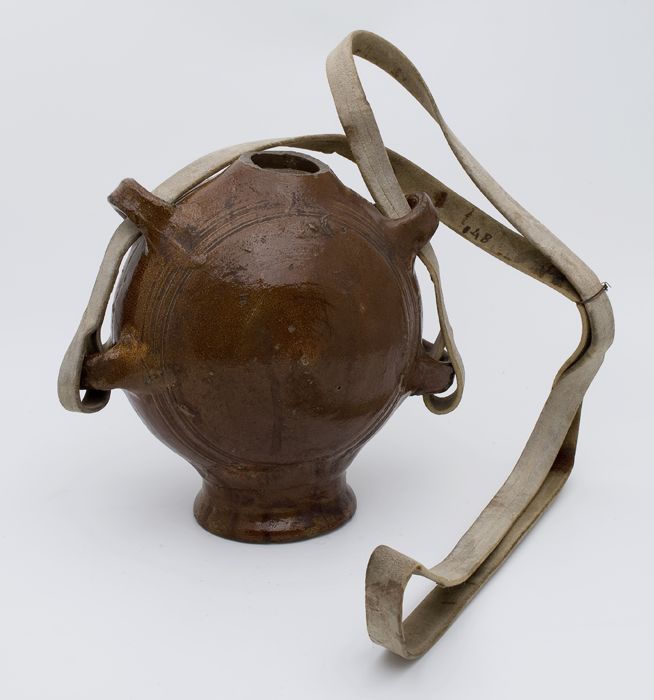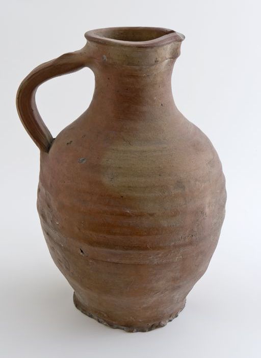 Bruine steengoed kan, op buik fries met arcades, mus...