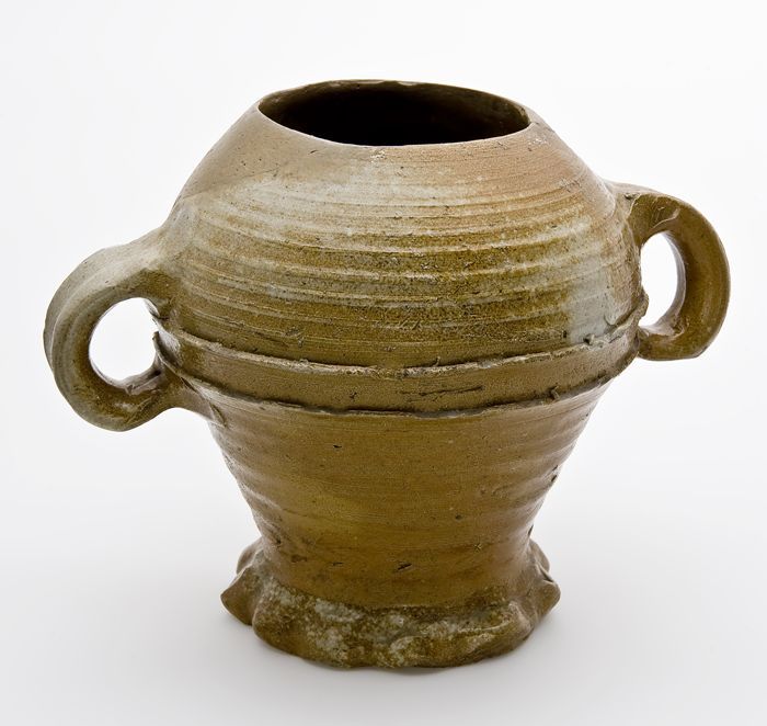 Kleine steengoed kan met oor, lage buik en slanke ha...