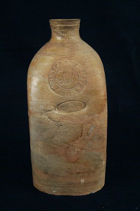 Steengoed kruik, rond buik fries met tekst, waarbove...