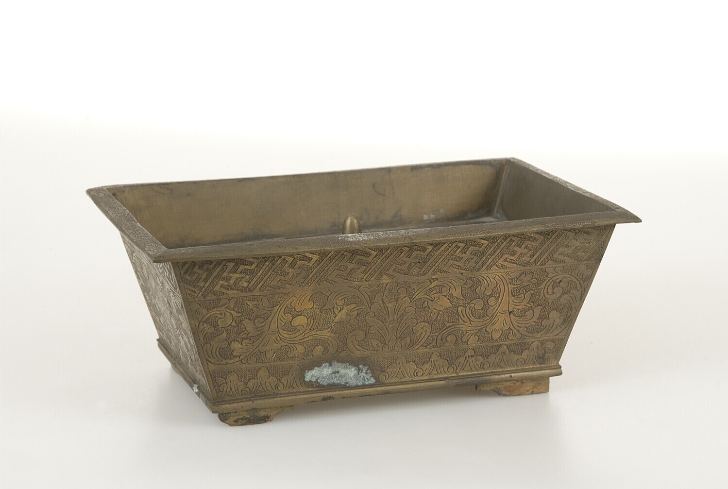 Geelkoperen bak van een rechthoekig sirihstel en een...