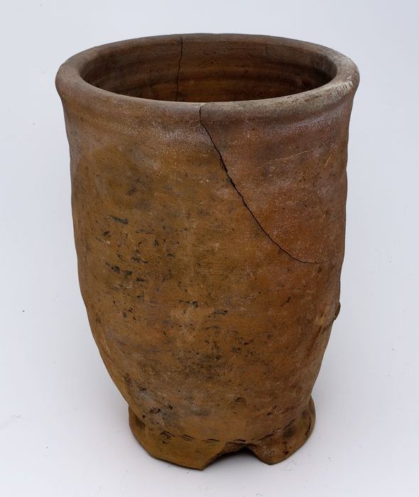 Aardewerk pot, bijna cilindrisch van vorm op licht g...