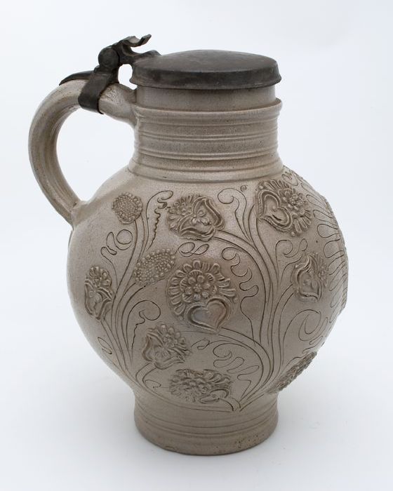 Steengoed buikkan met tinnen deksel, appliqué en sgr...