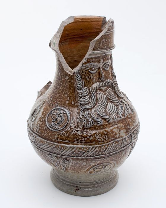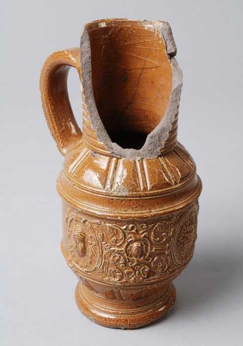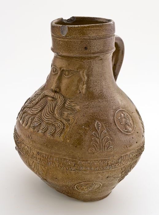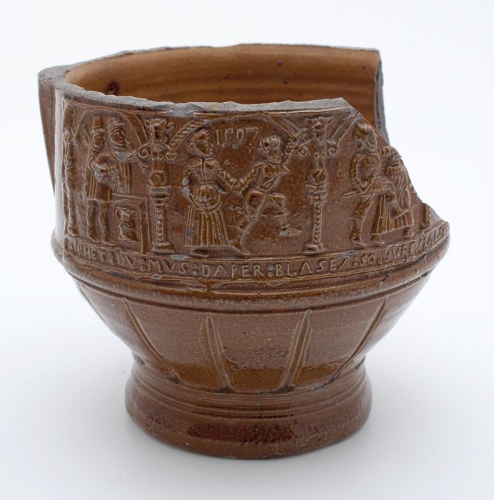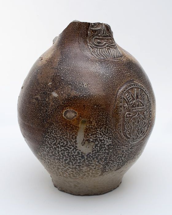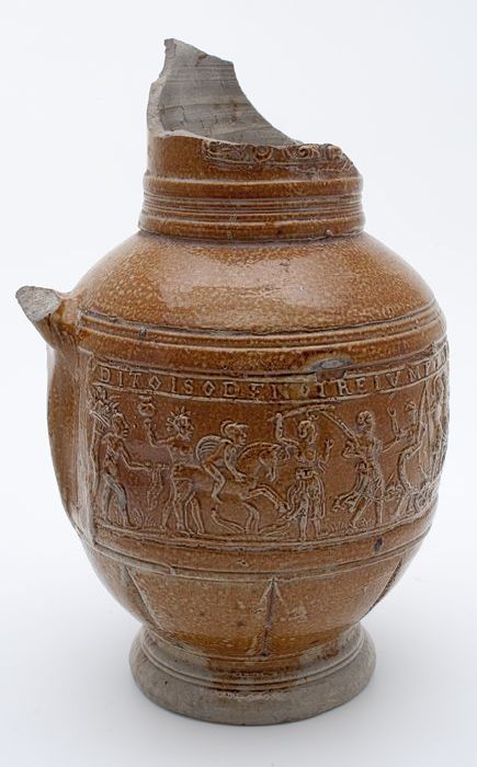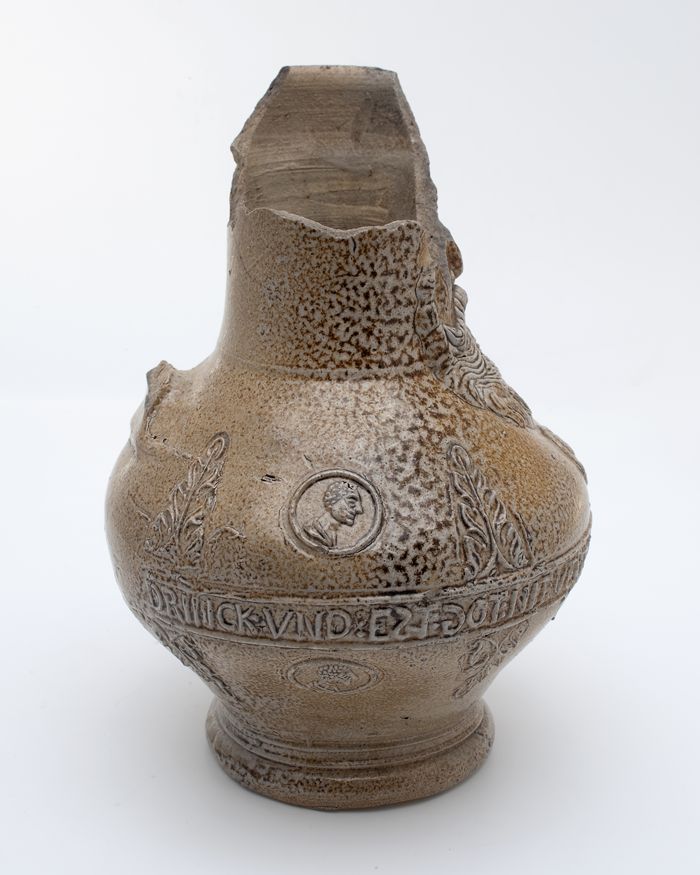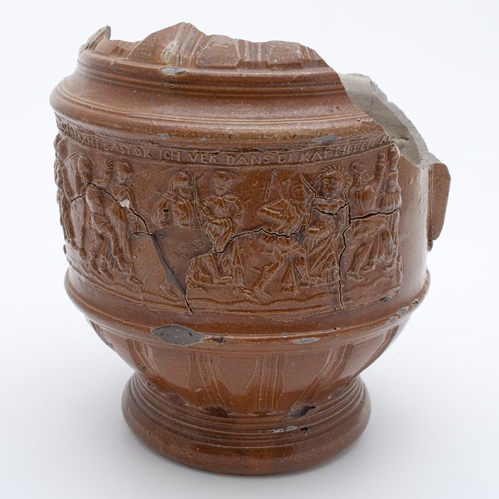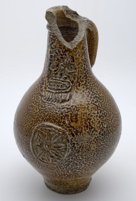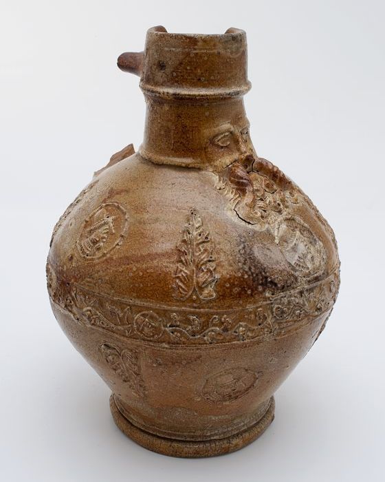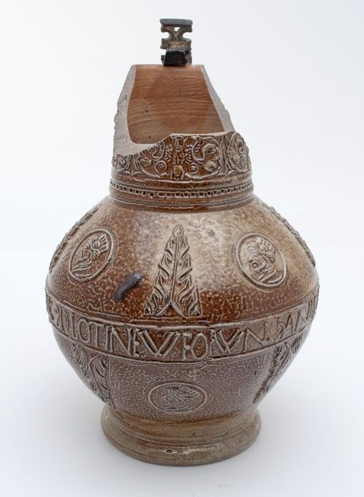 Bruine steengoed kan met om hals een fries met medai...