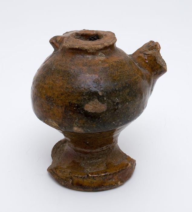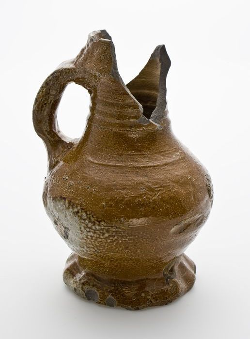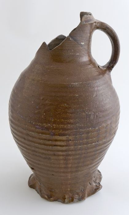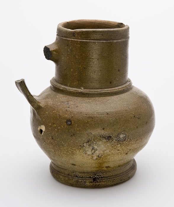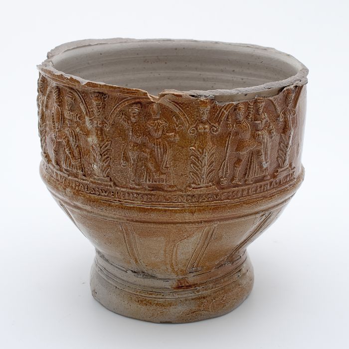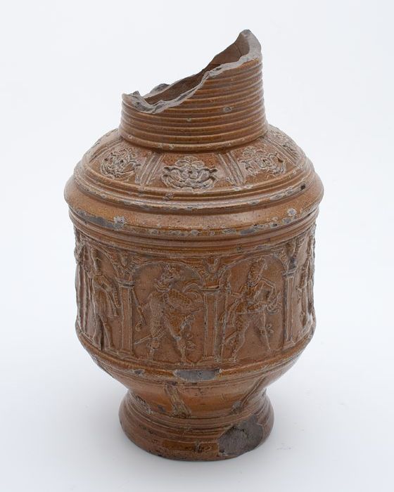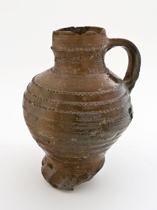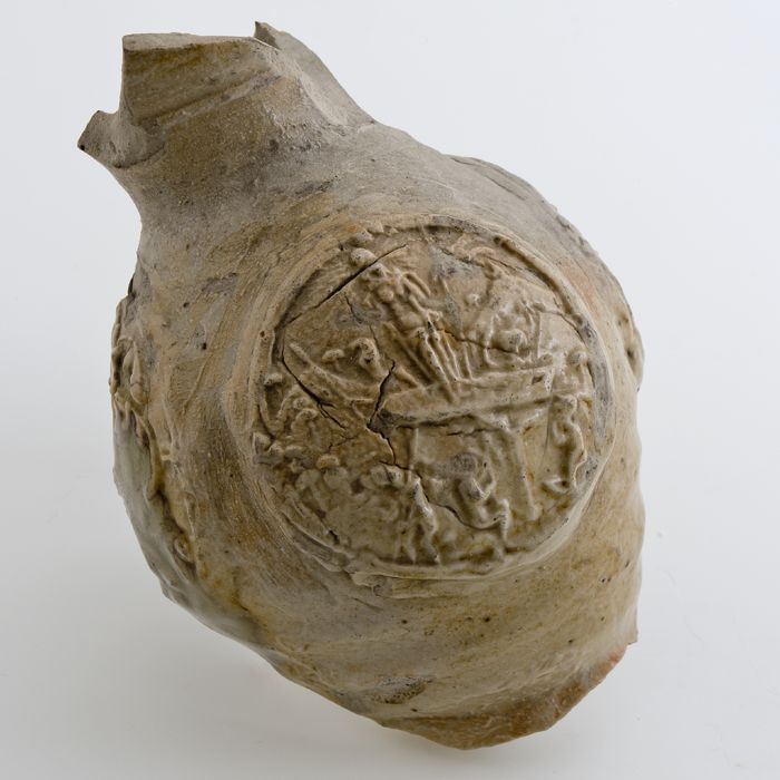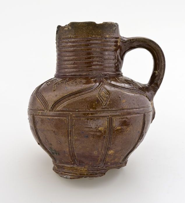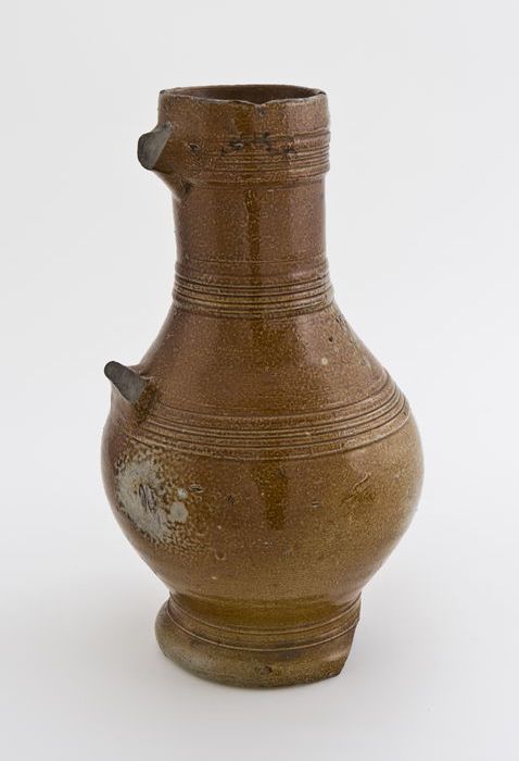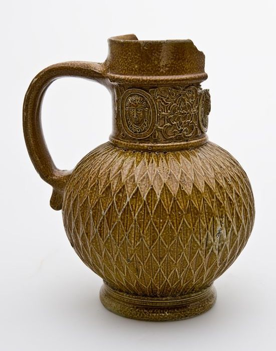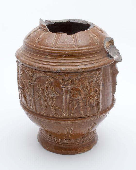 Bruine steengoed kan met om hals een fries met medai...