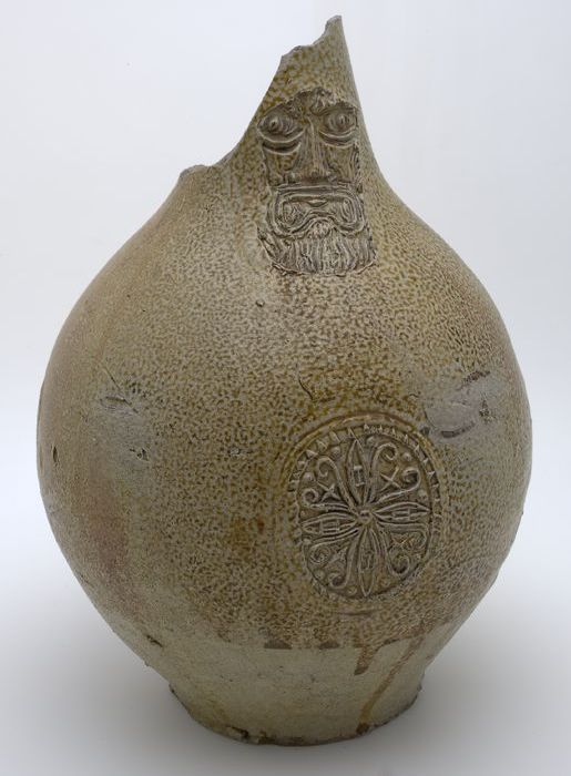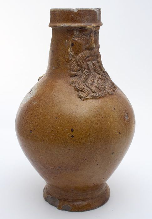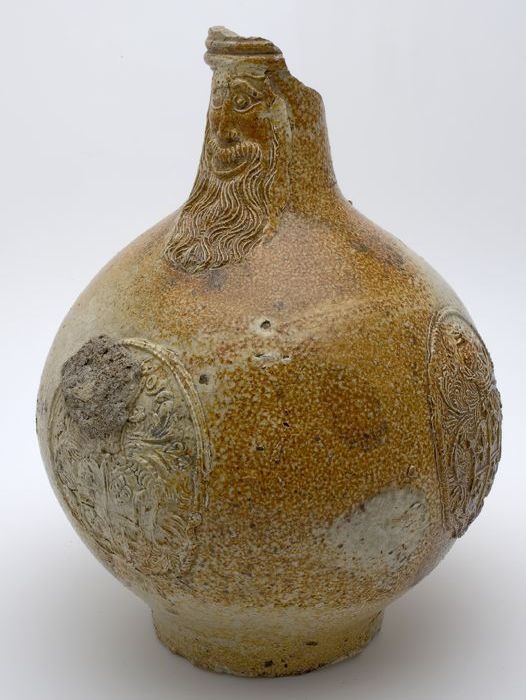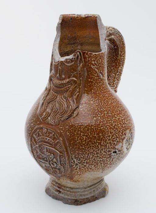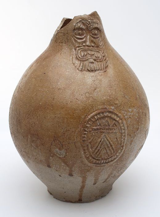 Baardmankruik, onder baardmanmasker drie wapenschild...