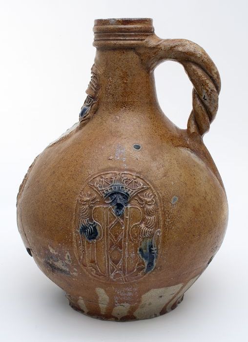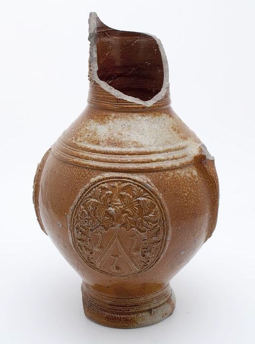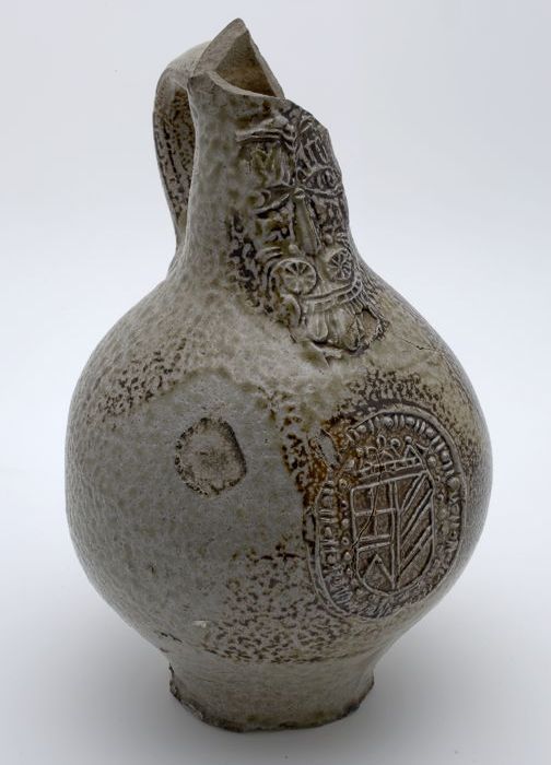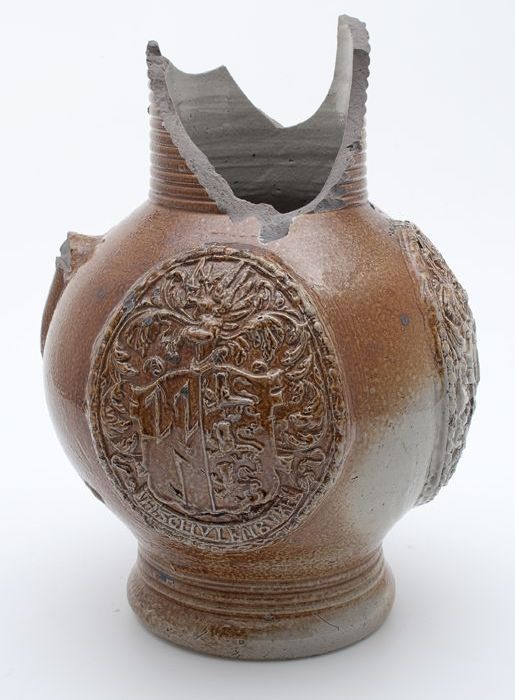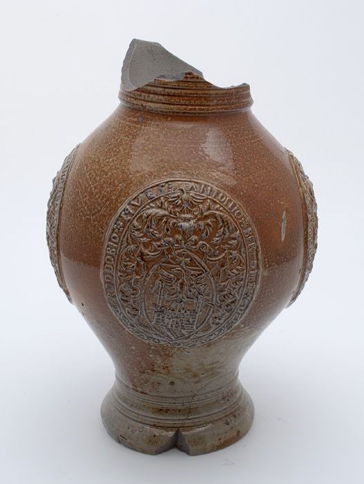 Steengoed kruik, rondom buik drie ovalen waarin wape...