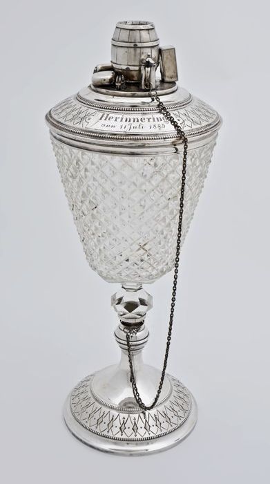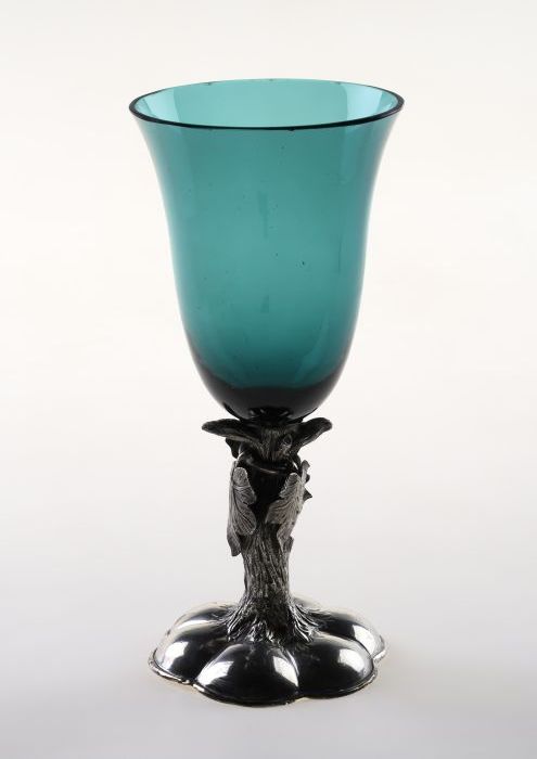 Glazen beker op zilveren voet en met zilveren deksel...