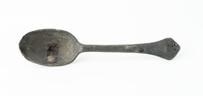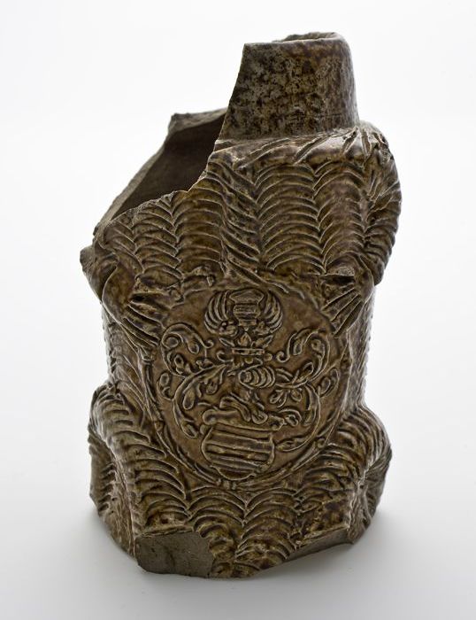 Steengoed kan met fries rond hals, drie wapenmedaill...