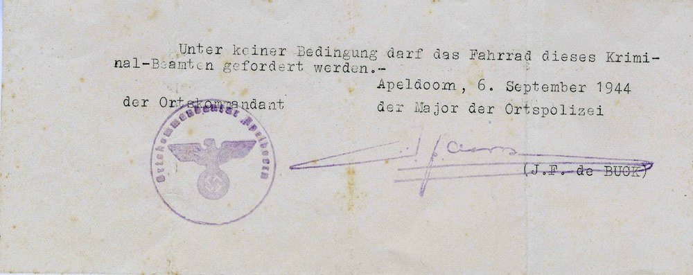 vrijstellingsbewijs invordering fiets, 06-09-1944
