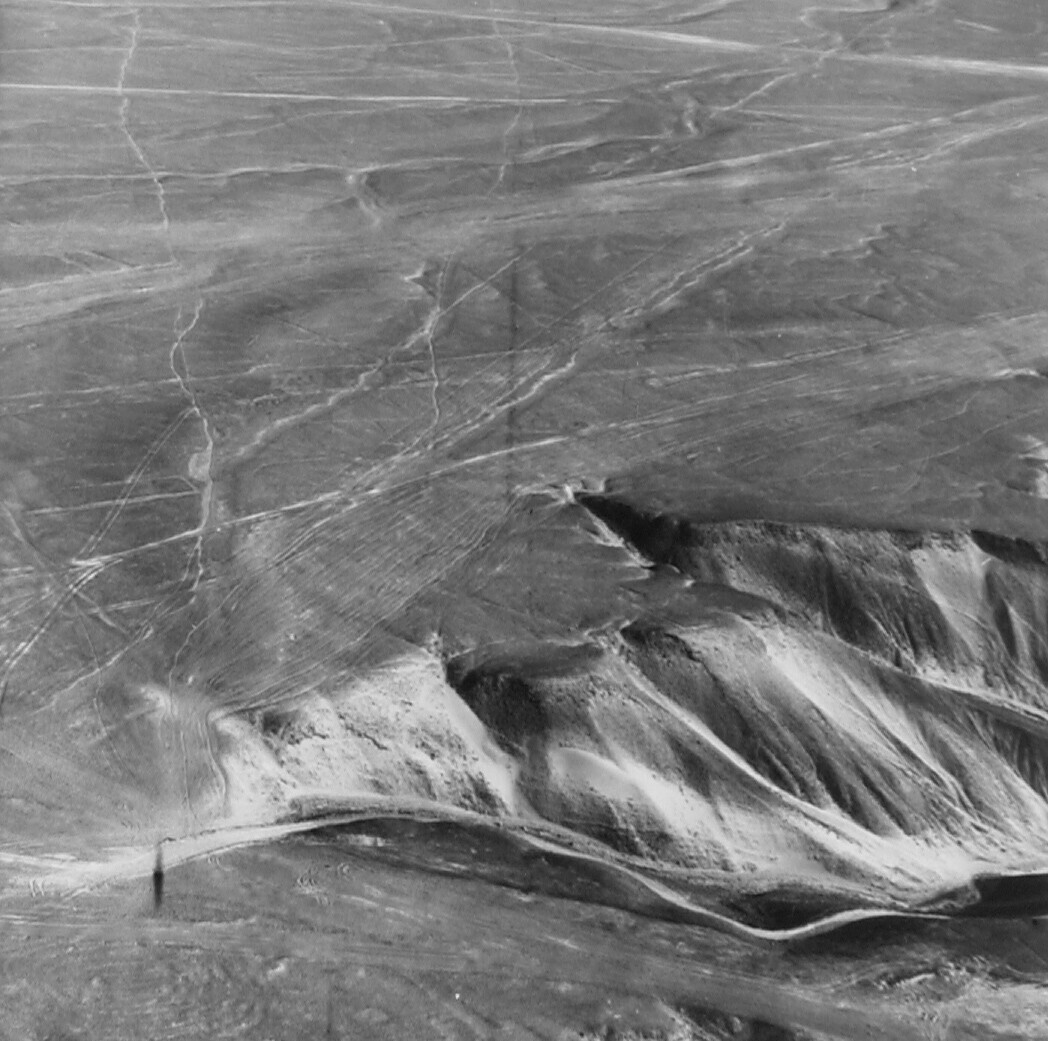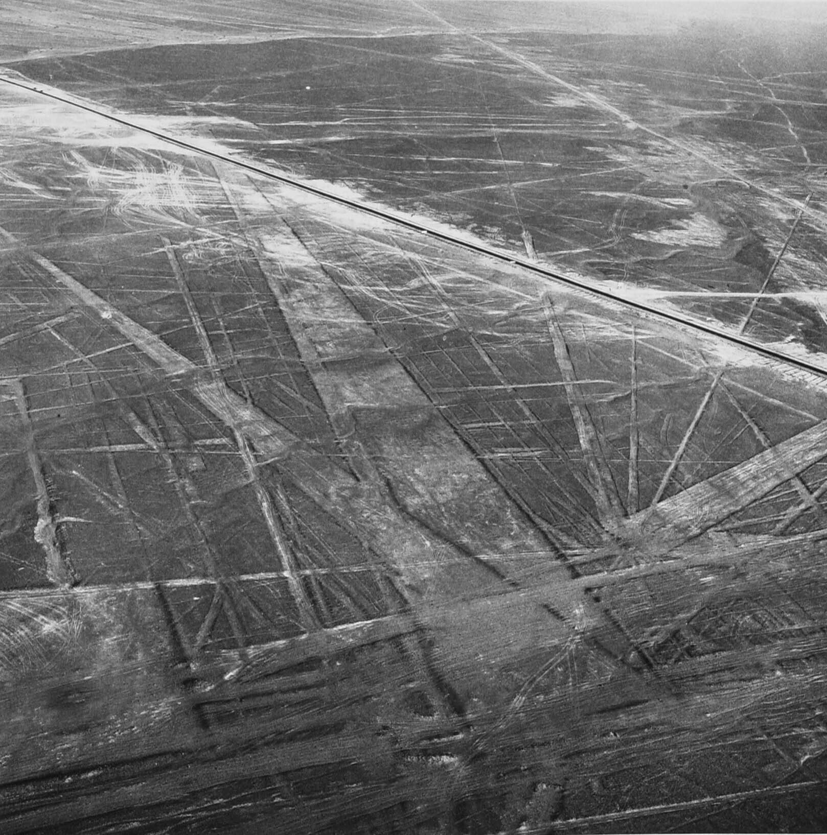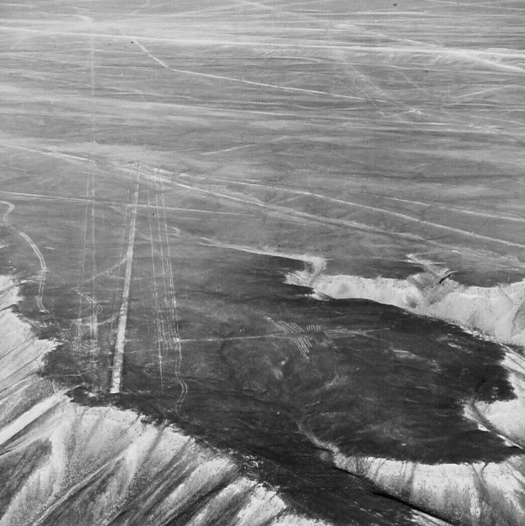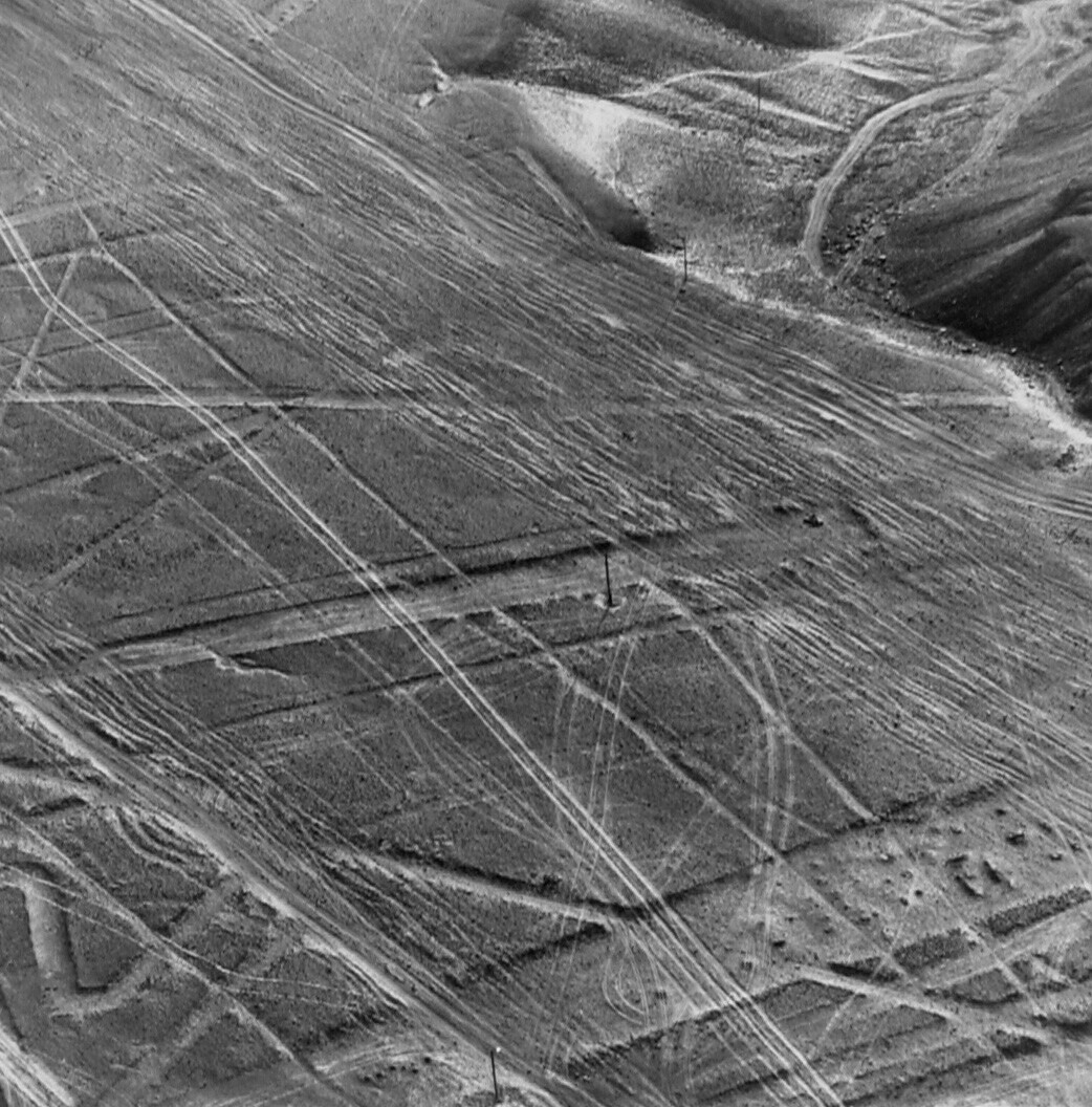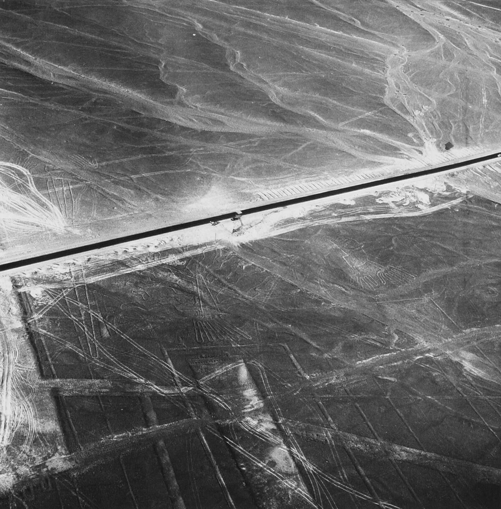 Luchtopname van Nasca tekeningen. Bulldozer- en auto...