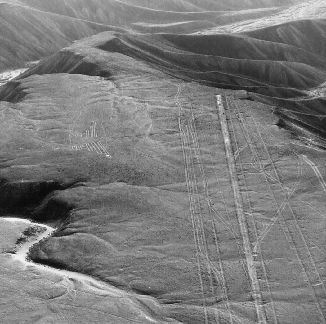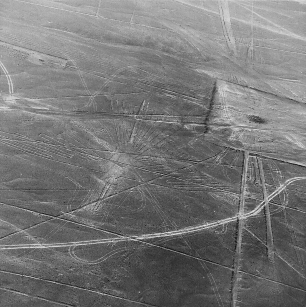 Luchtopname van de Nasca tekeningen. Links de kolibi...