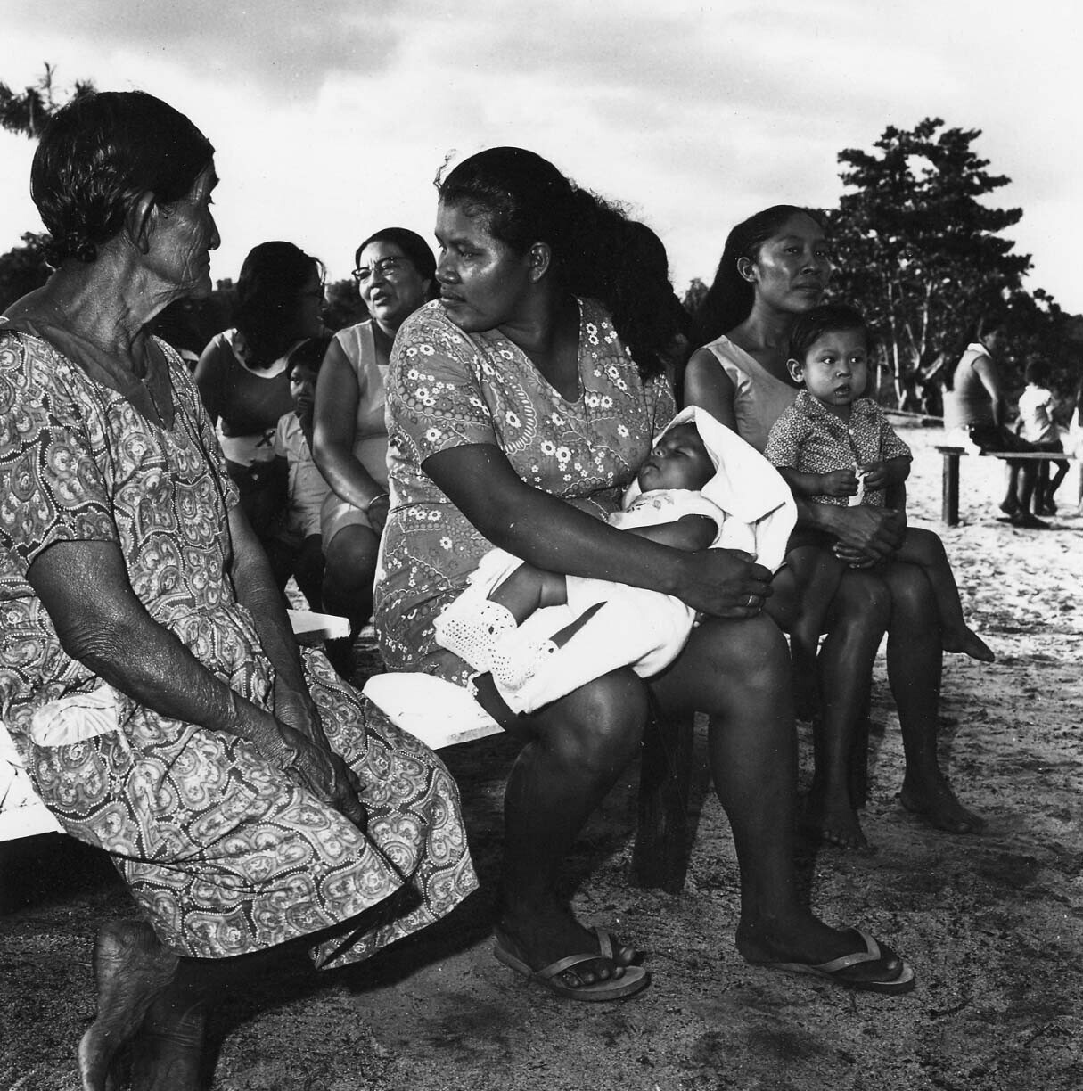 Vrouwen en kinderen bij een marktkraam op het dorpsp...