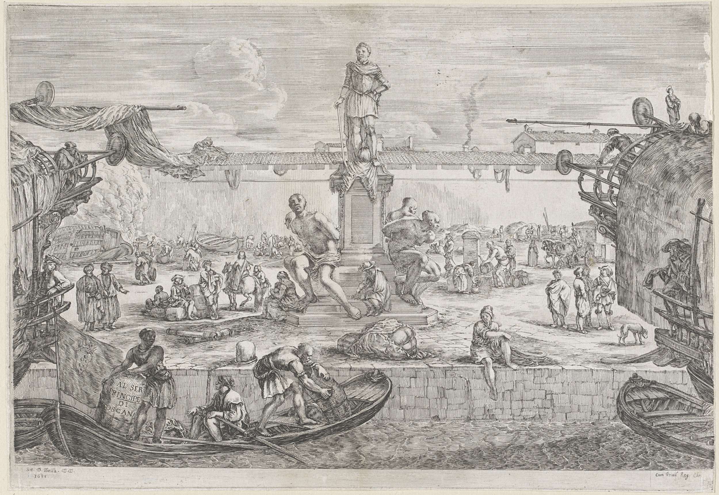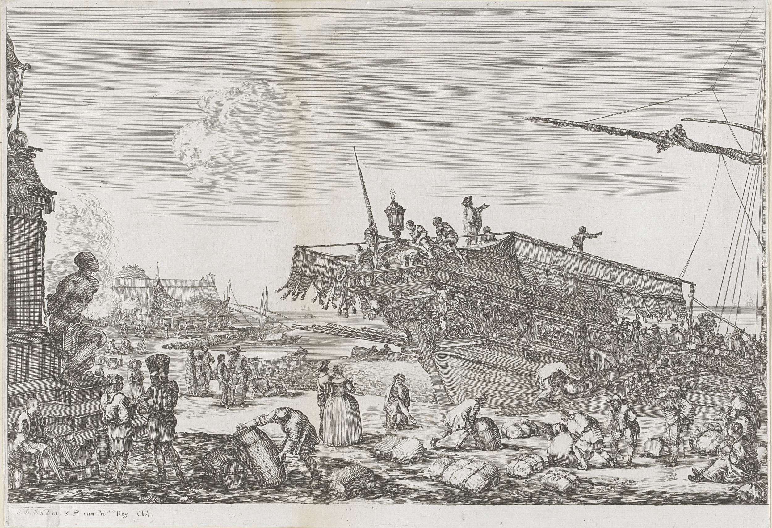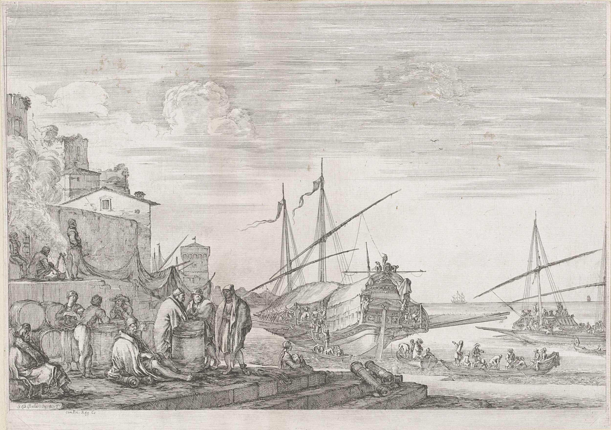 Inladen van galeischip in de haven van Livorno