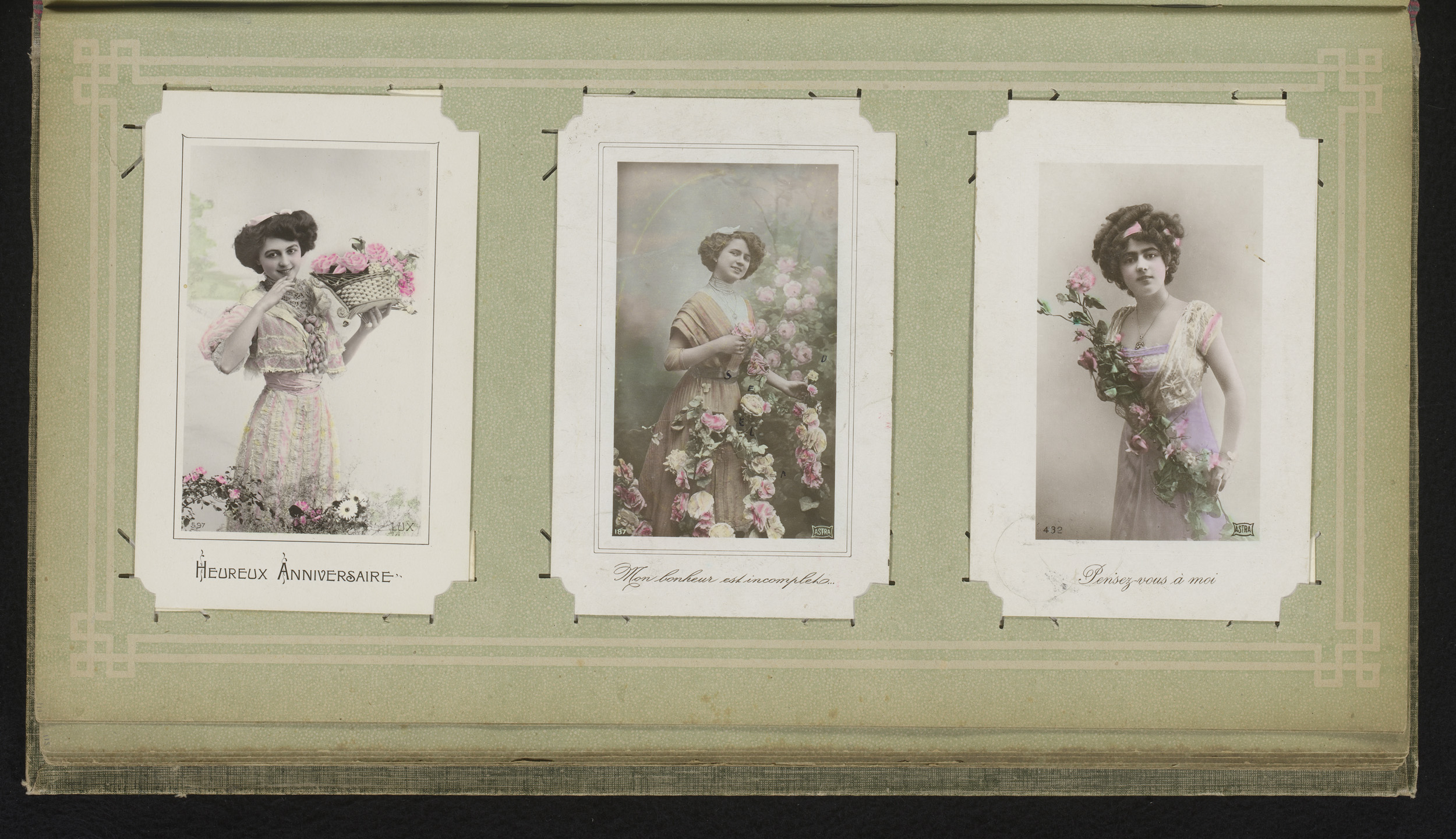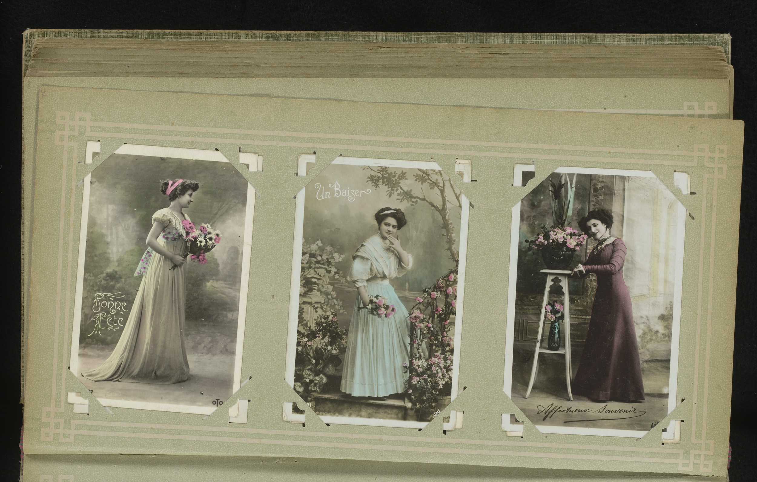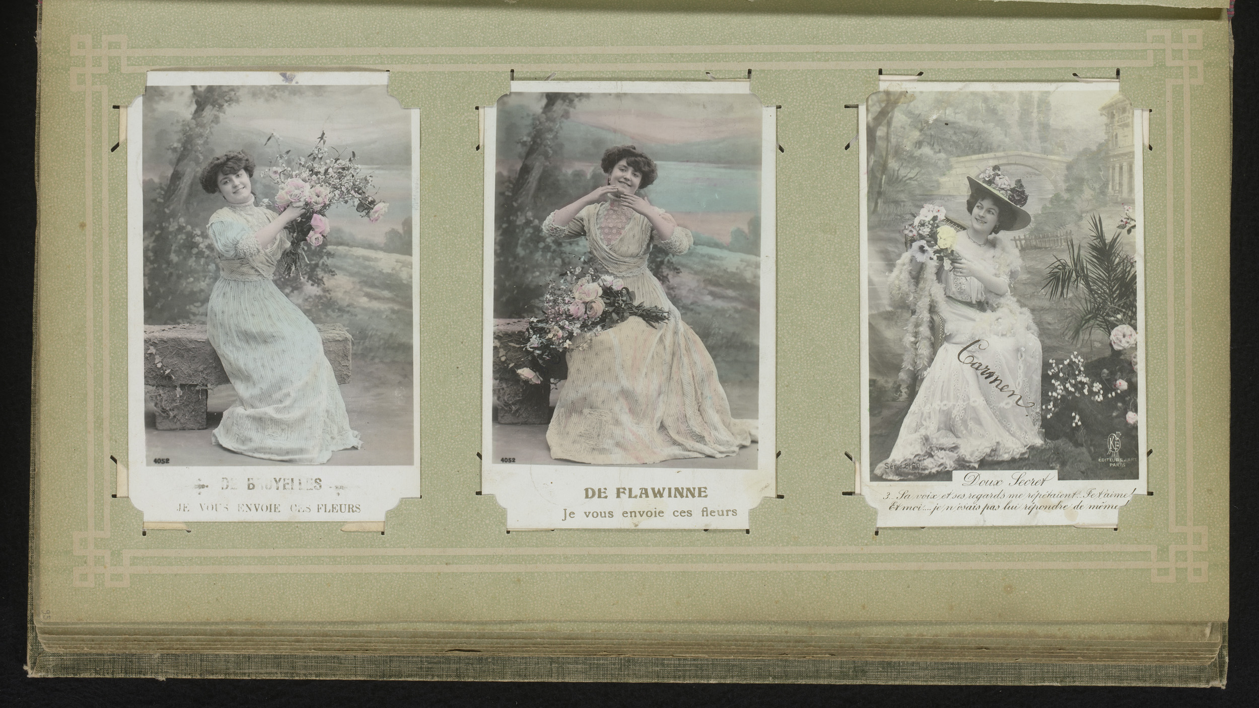 Drie portretten van jonge vrouwen met bloemen