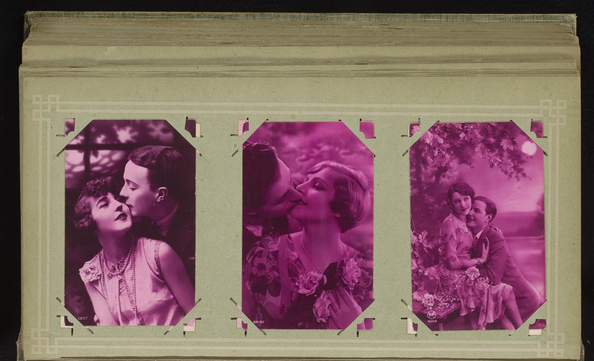 Drie portretten van een kussend paar