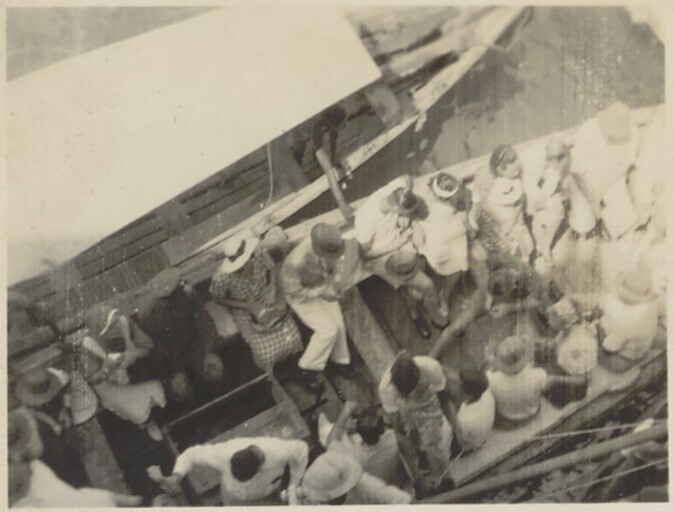 Reizigers gaan aan wal, op weg naar Nederlands Indië