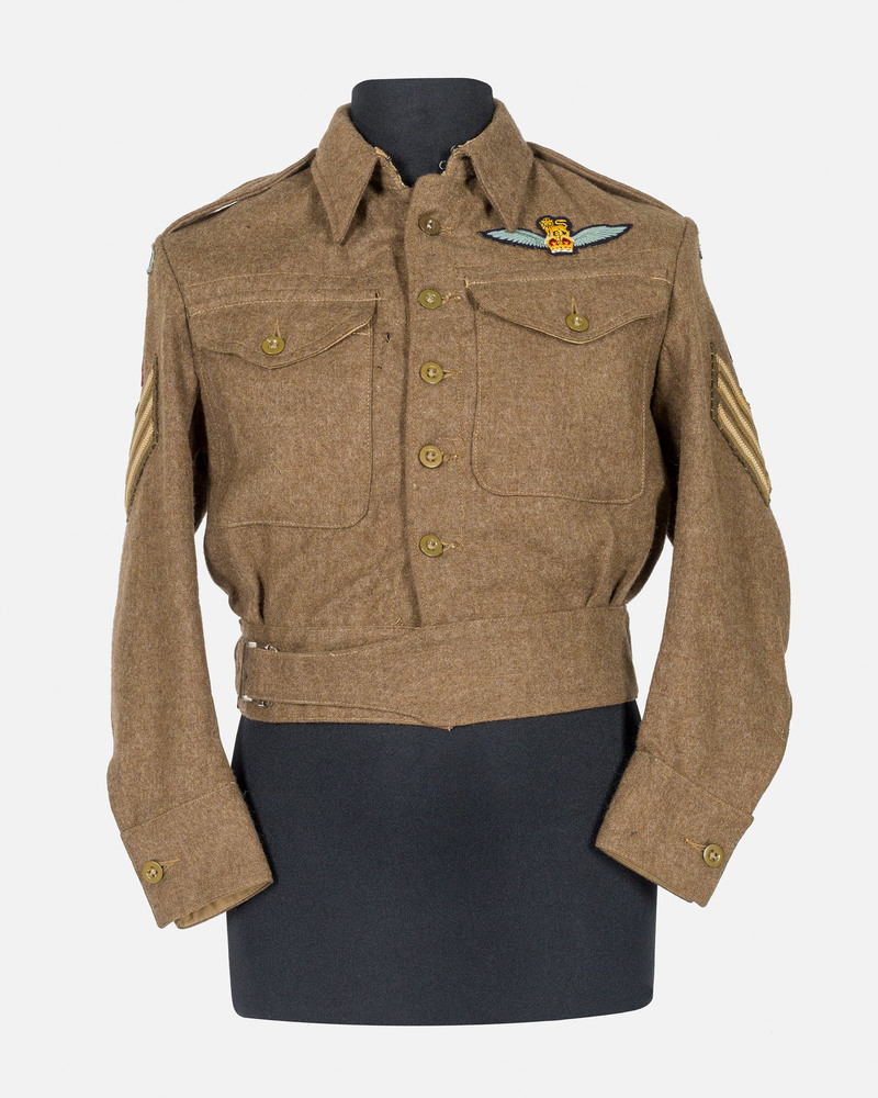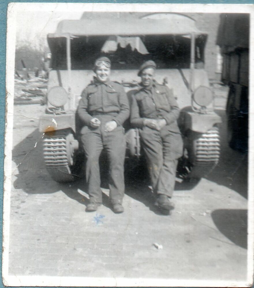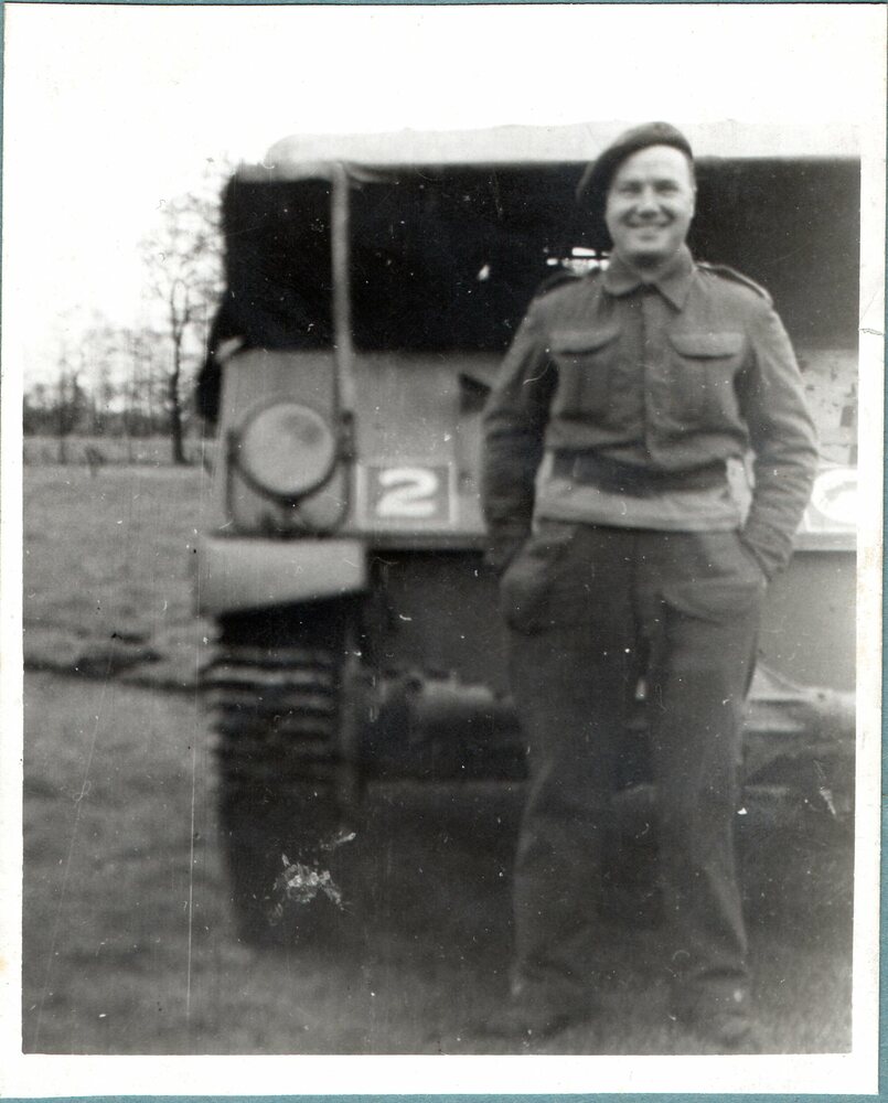 Gunner Arthur Edward Lomas voor een Bren Gun Carrier.
