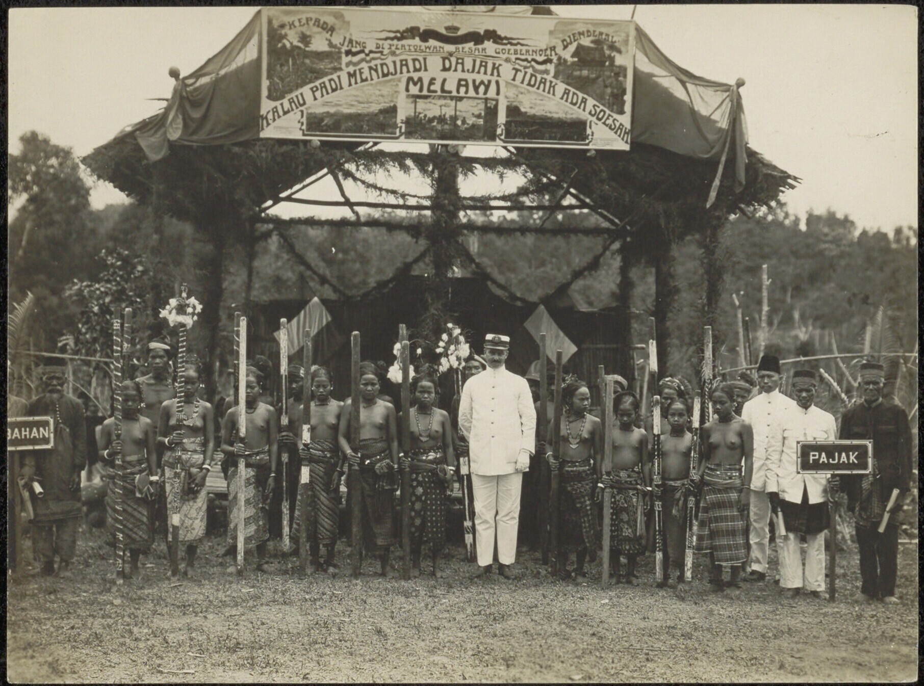 Een groep Kebahan Dajaks onder een erepoort tijdens ...