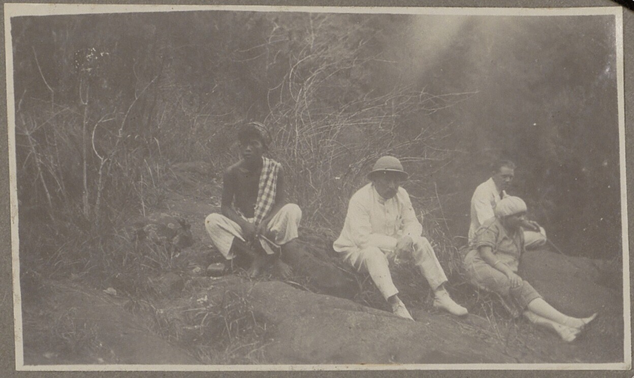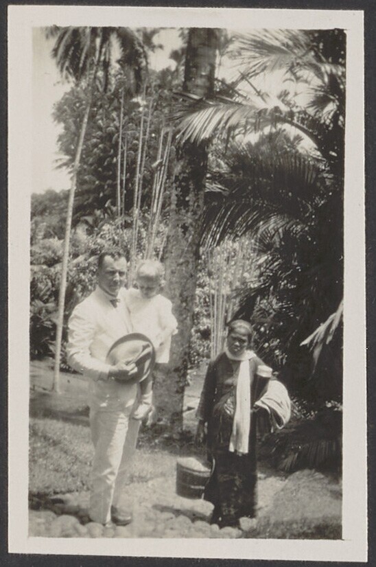 Javaanse landarbeiders en Europees kind in de tuin