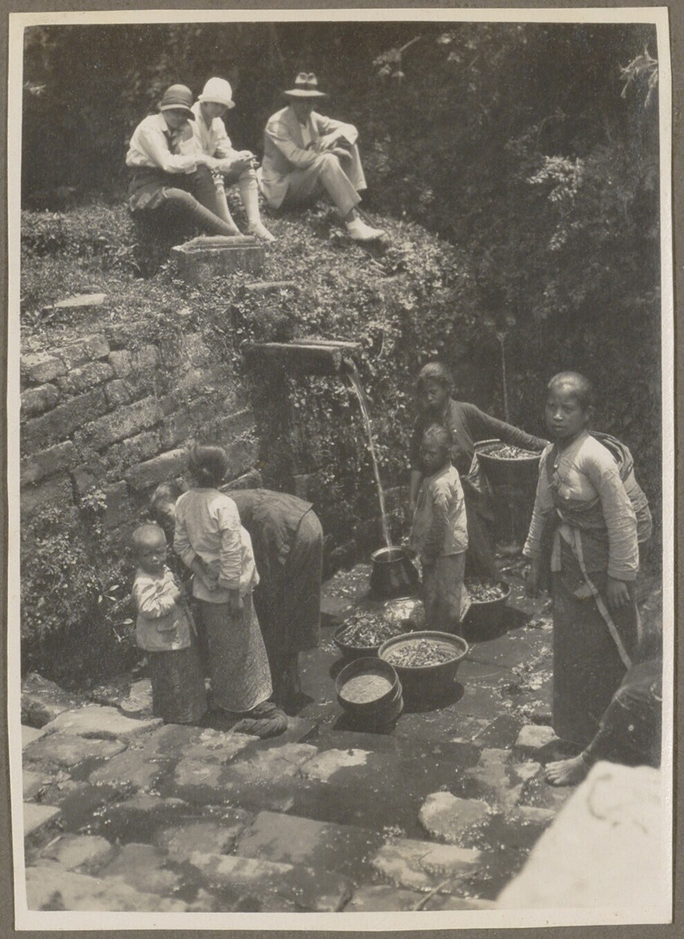 Europese kinderen zittend in de tuin, met een Javaan...