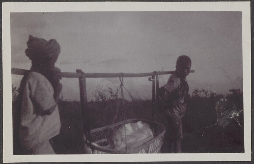 Nederlandse baby in rieten wieg gedragen door twee d...