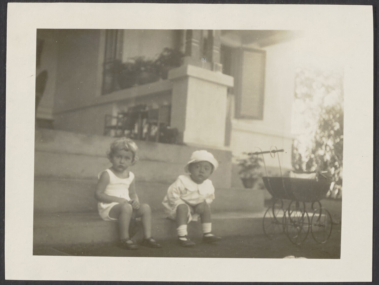 Europees en Javaans kind op trap bij veranda; poppen...