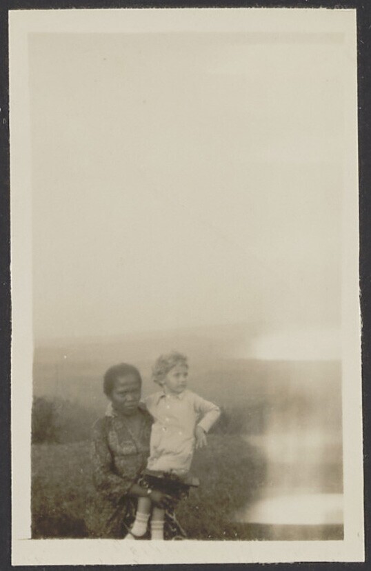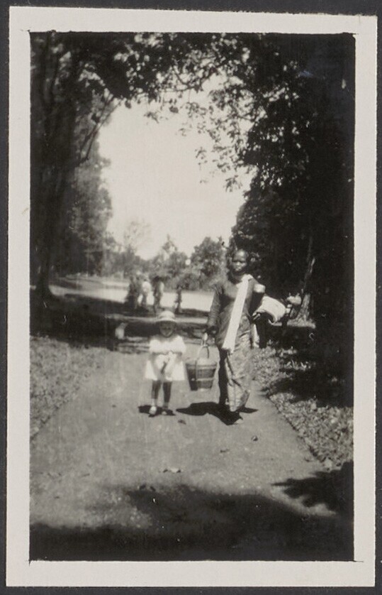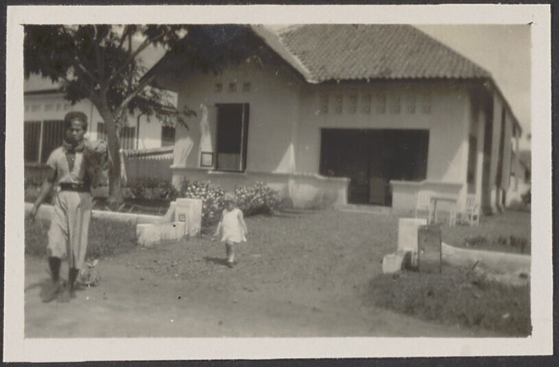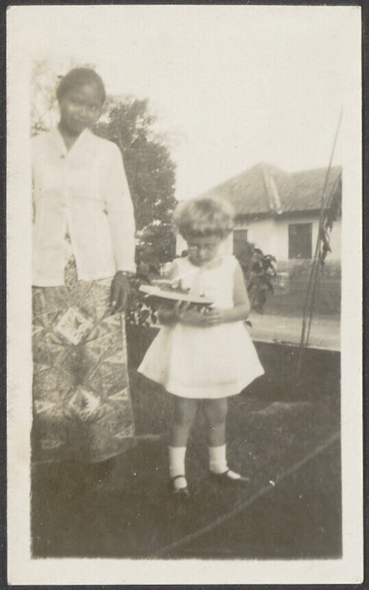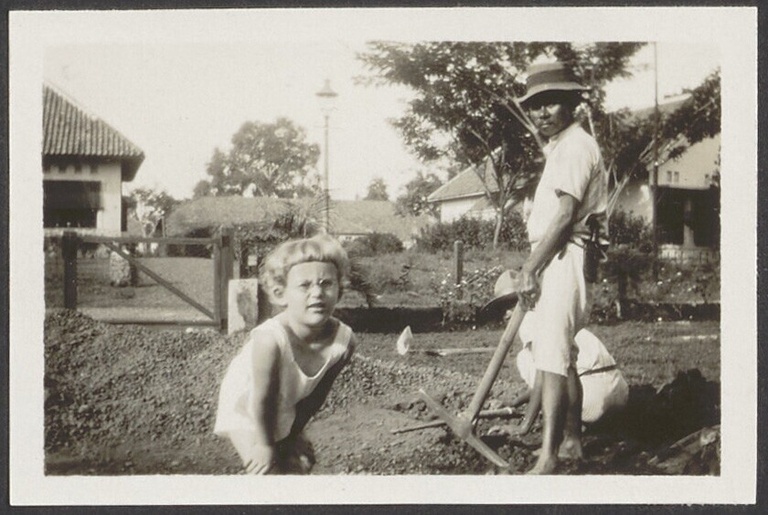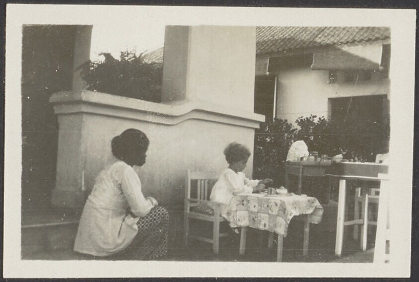Europees kind met Javaanse kinderverzorgster in de tuin