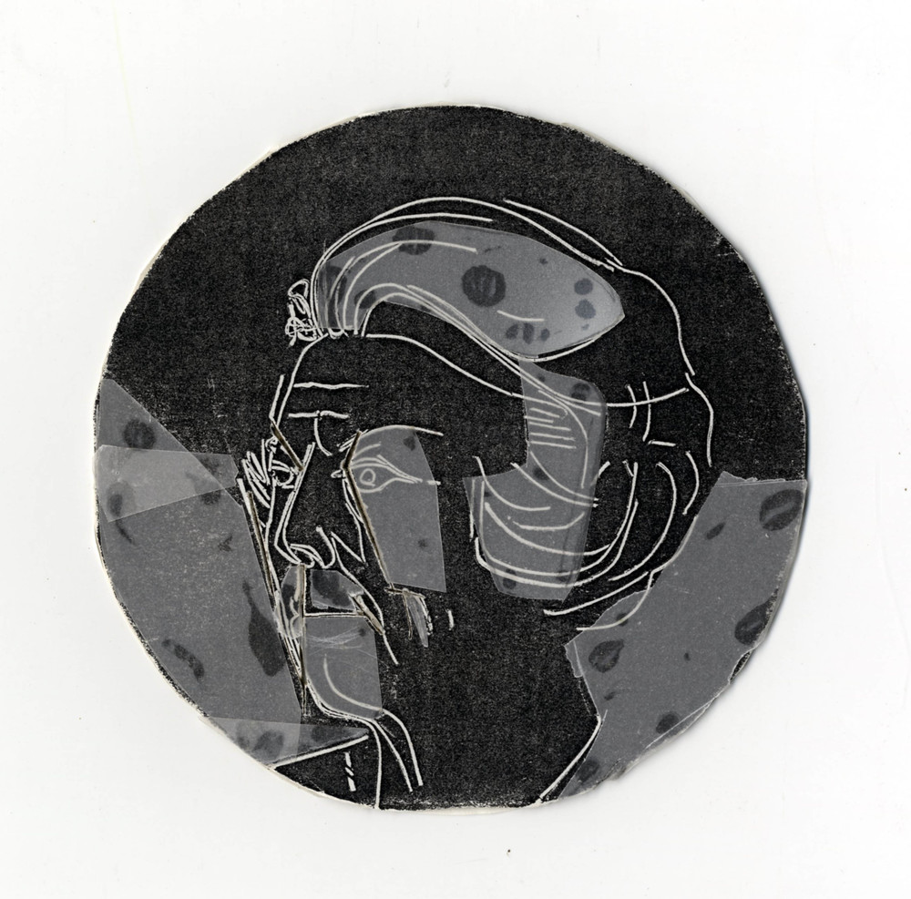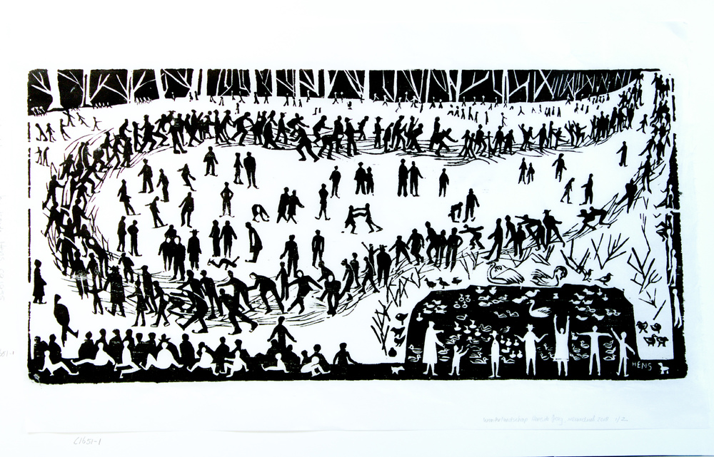 Houtsnede nieuwdruk 'lange rij schaatsers op het ijs...