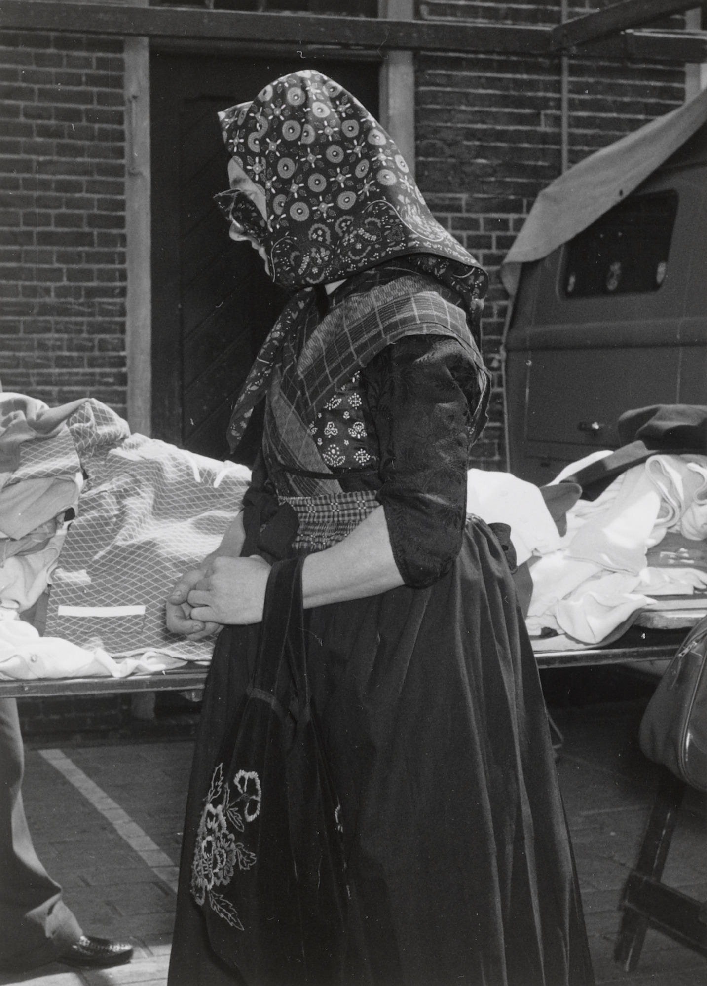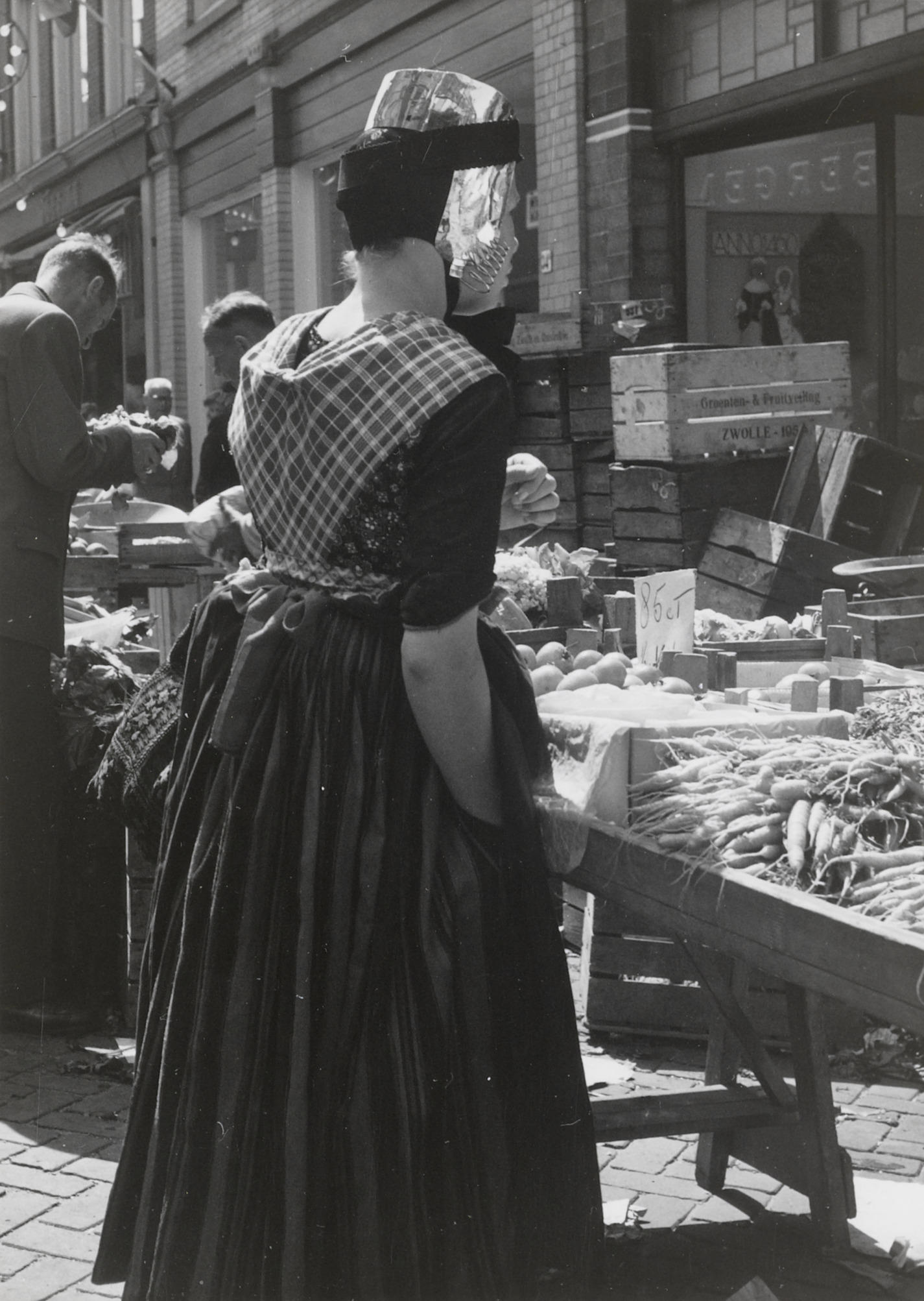 Vrouw in Staphorster dracht op de markt, Meppel, 196...