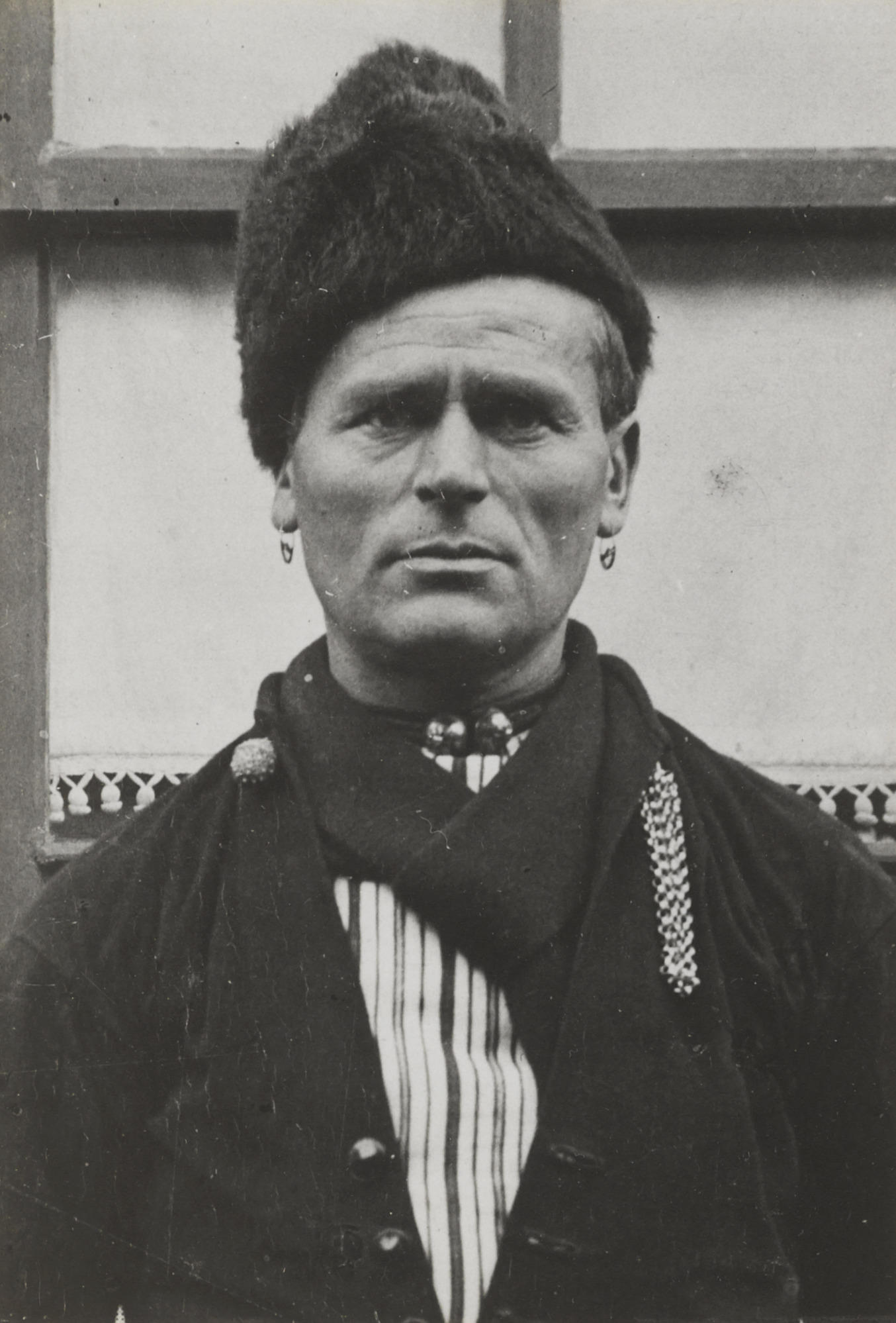 Omroeper Piet Veerman, Volendam, 1915 (zwart-wit foto)