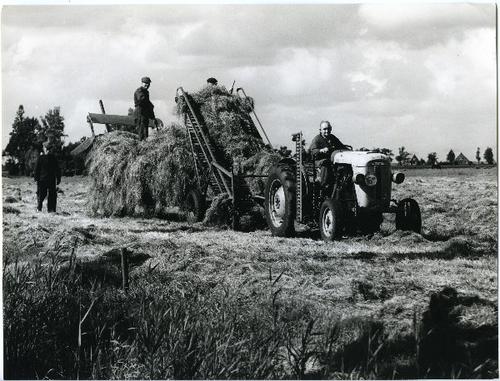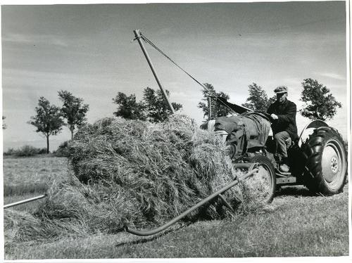 Foto in zwart-wit van een pakkenpers voor hooi door ...