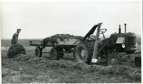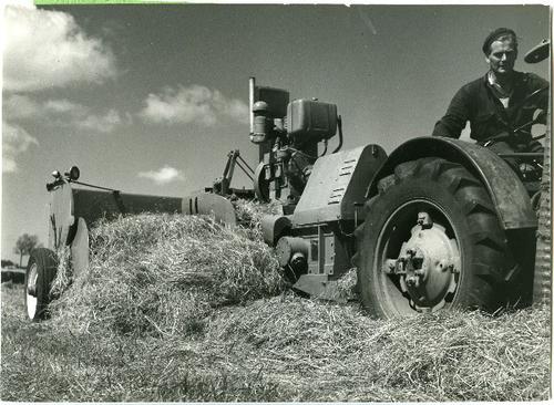 Foto in zwart-wit van een tractor met een hooischuiv...