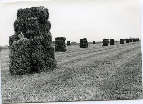 Foto in zwart-wit van stapels hooipakken in een weil...