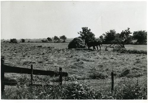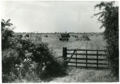 Foto in zwart-wit van een hooiland door J.D. de Jong...