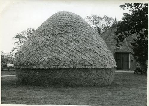 Foto in zwart-wit van een hooiberg afgedekt met riet...