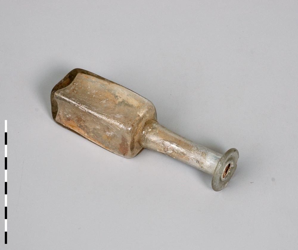Kleine fles van vrijwel kleurloos glas uit de Romein...