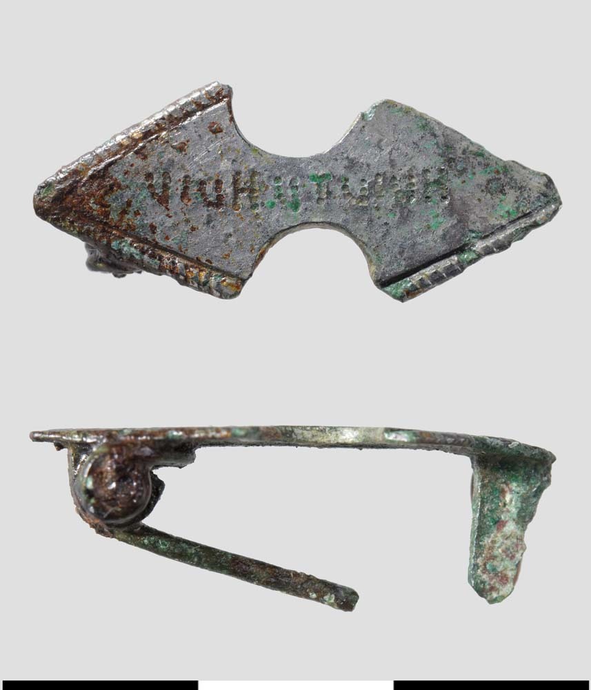 Platte schijffibula van vertind brons uit de Romeins...