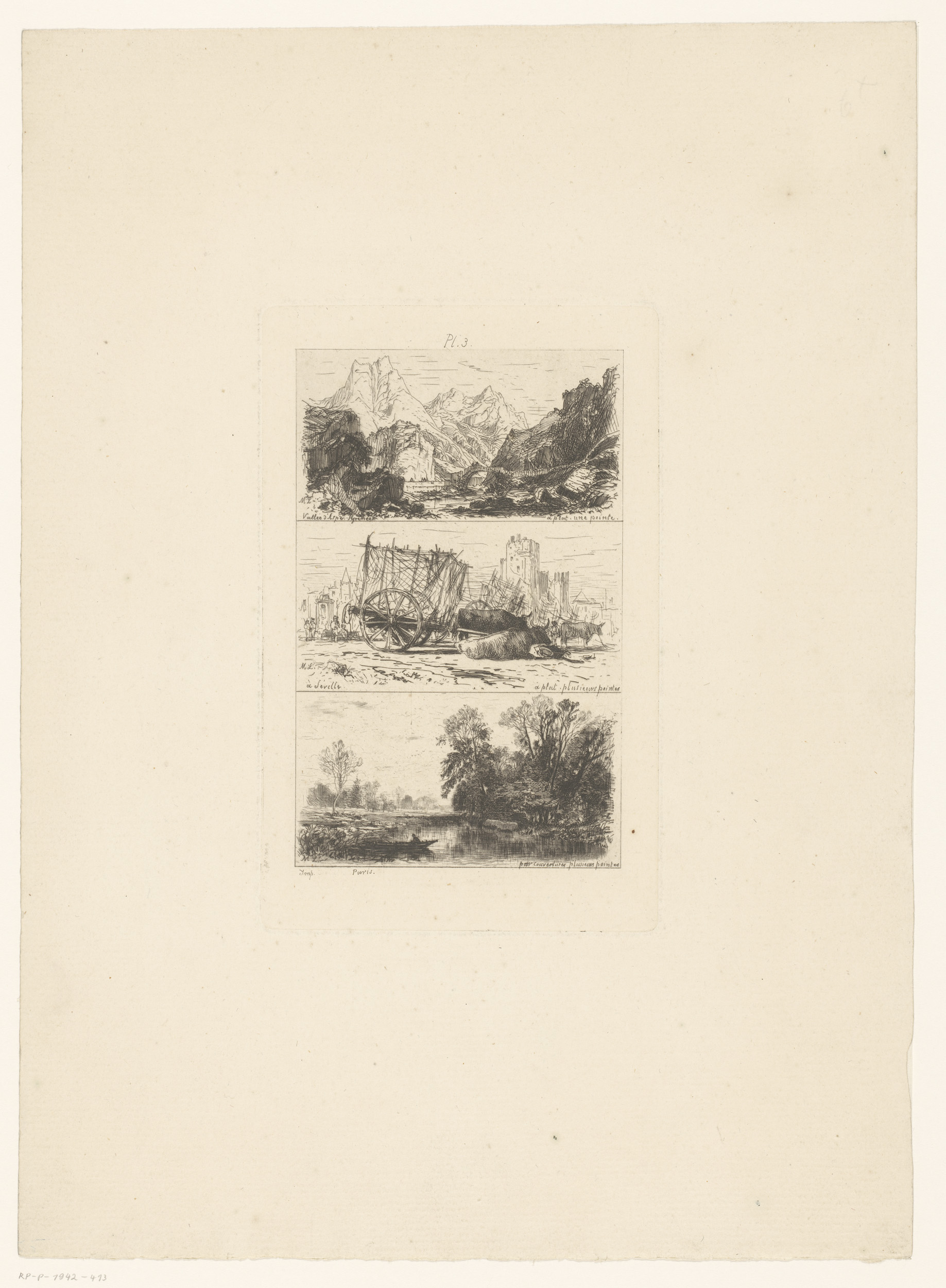 Drie landschappen met zicht op de Pyreneeën, Sevilla...