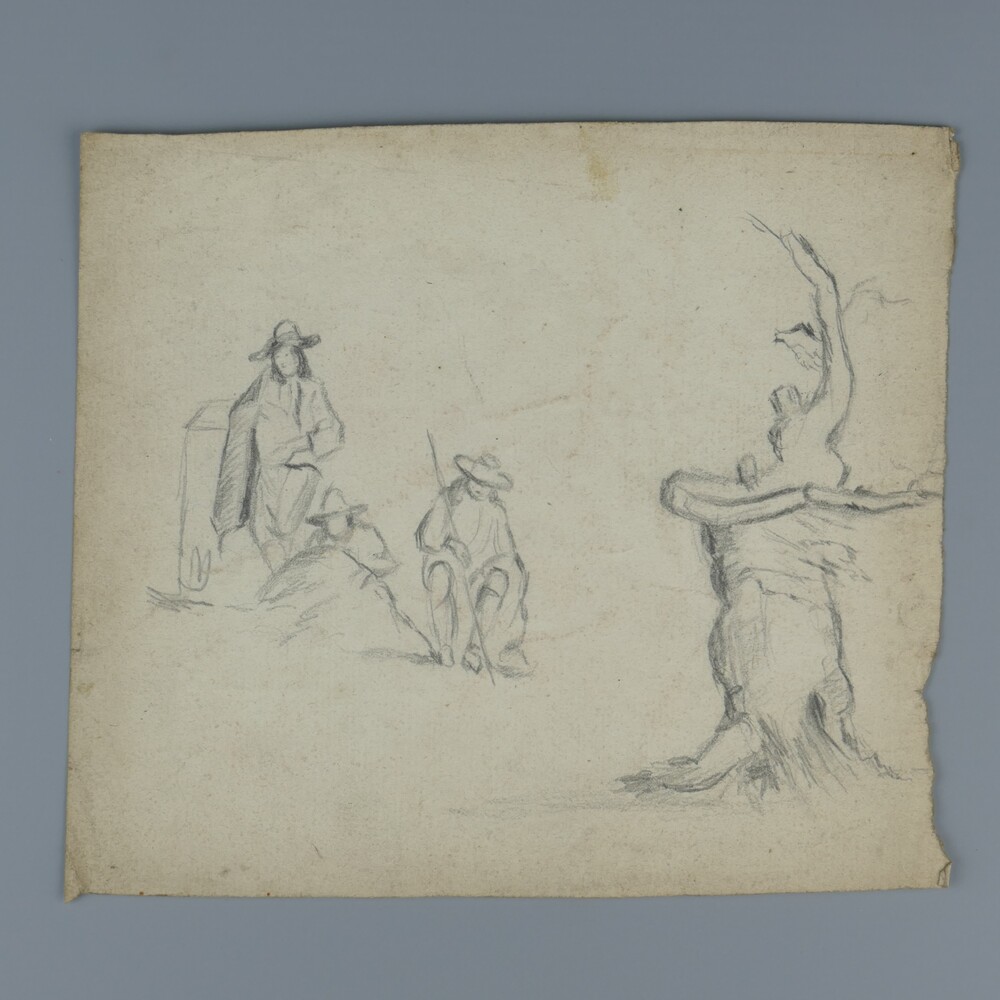 Potloodtekening op papier voorstellende drie mannen ...