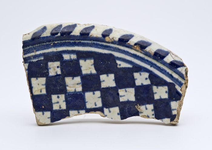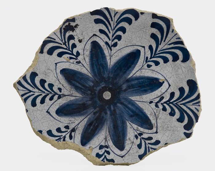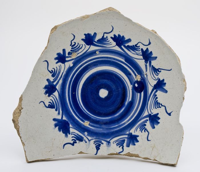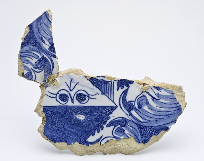 Fragment aardewerk tegel met gevlekt patroon in paar...