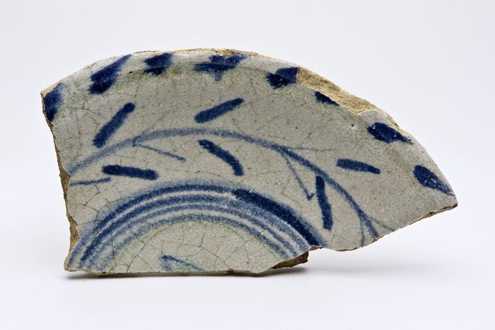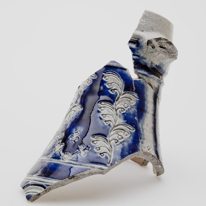Fragment steengoed kan met blauw en grijs glazuur, g...