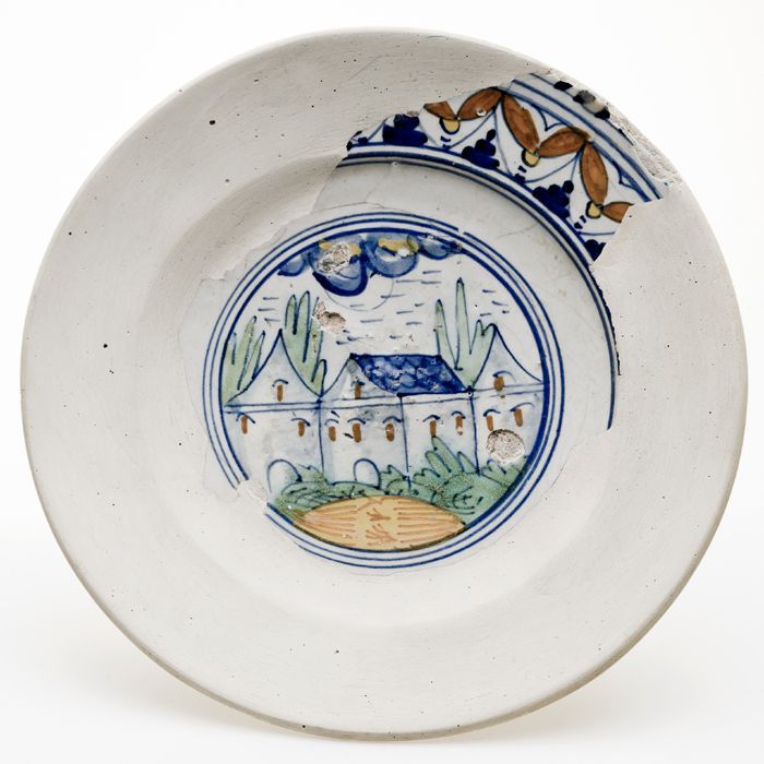 Gelijmde ziel van majolica schotel met polychrome fr...