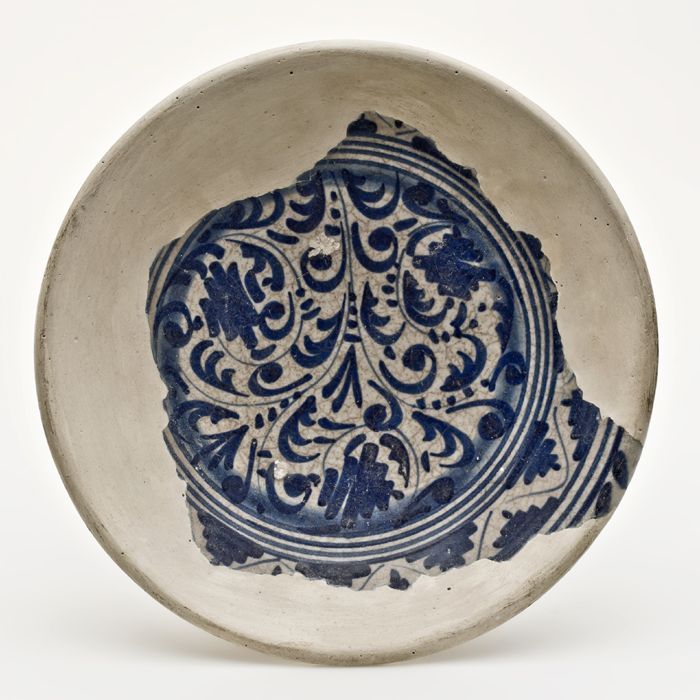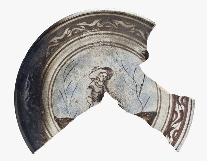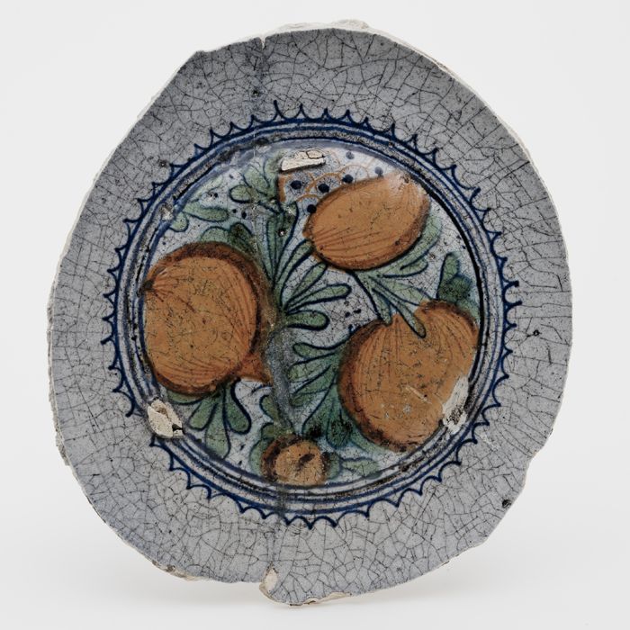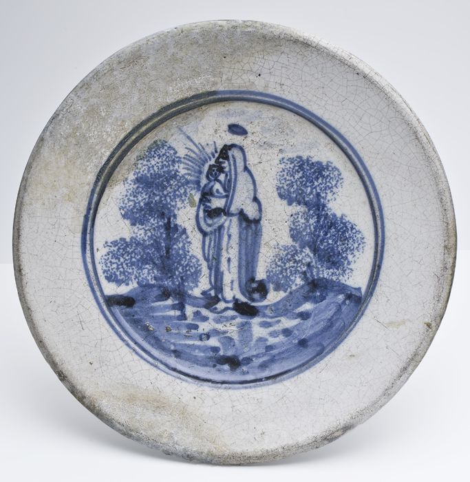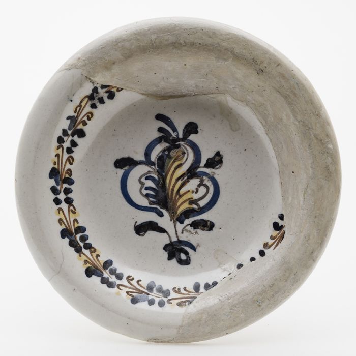 Ziel van majolica schotel met omkranste blauwe cirke...