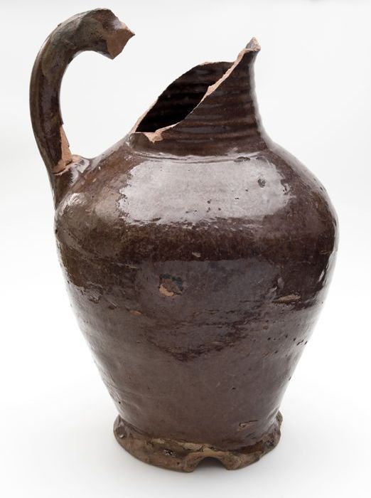 Aardewerk kan, rode scherf, geheel geglazuurd, op st...