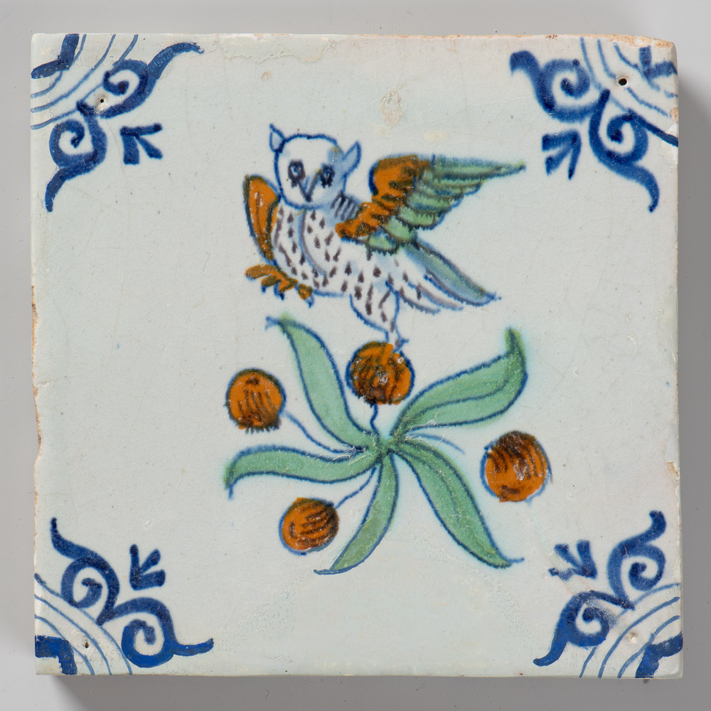 tegel van keramiek met tinglazuur, voorstellende: ui...