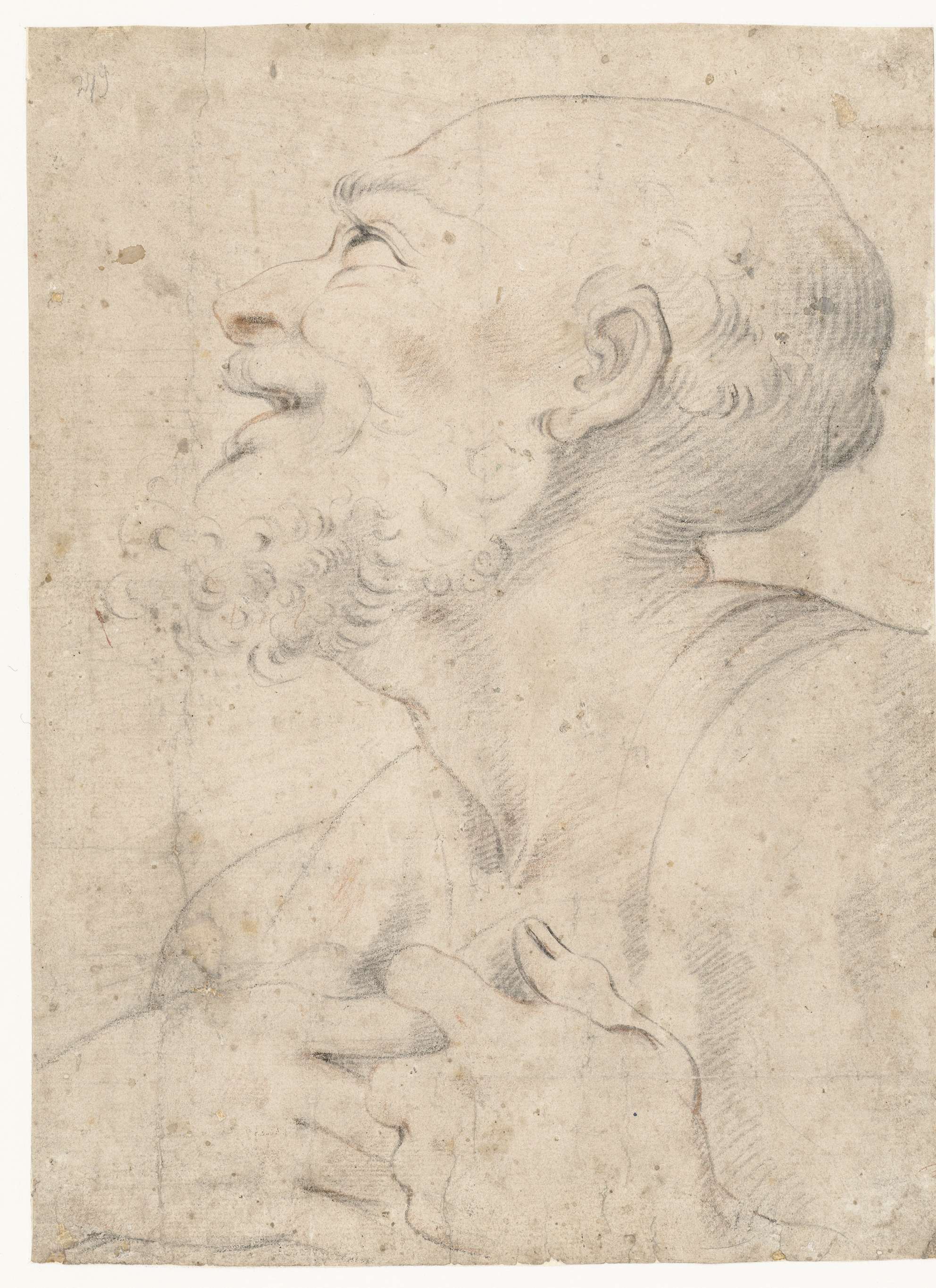 Borstbeeld van een lachende oude man, in profiel naa...