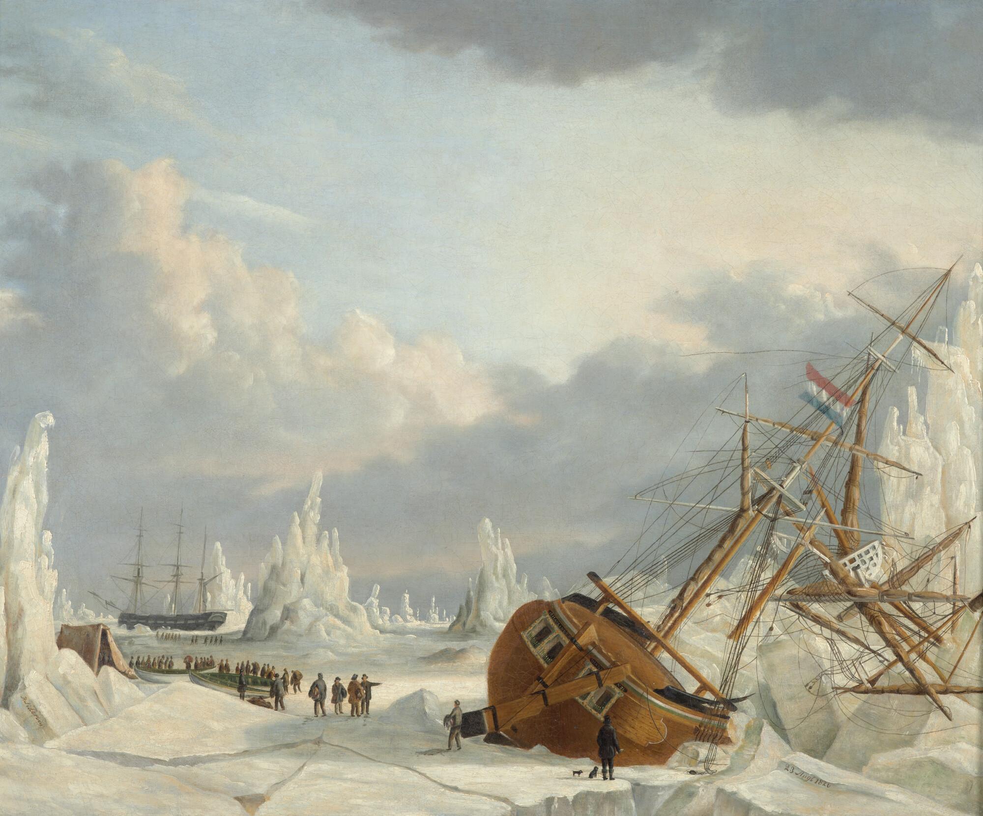 Het galjootschip Harlingen in het ijs in Straat Davi...