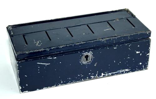 Spaardoos. Langwerpige donker blauwe, platte metale...