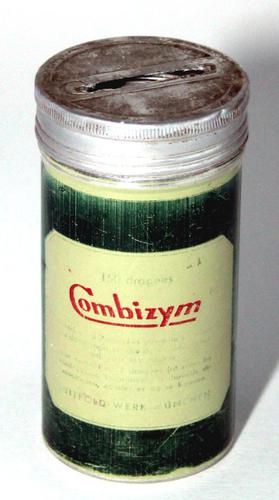 Spaarblik, Combizym, Langwerpig blikje met schroefdop.